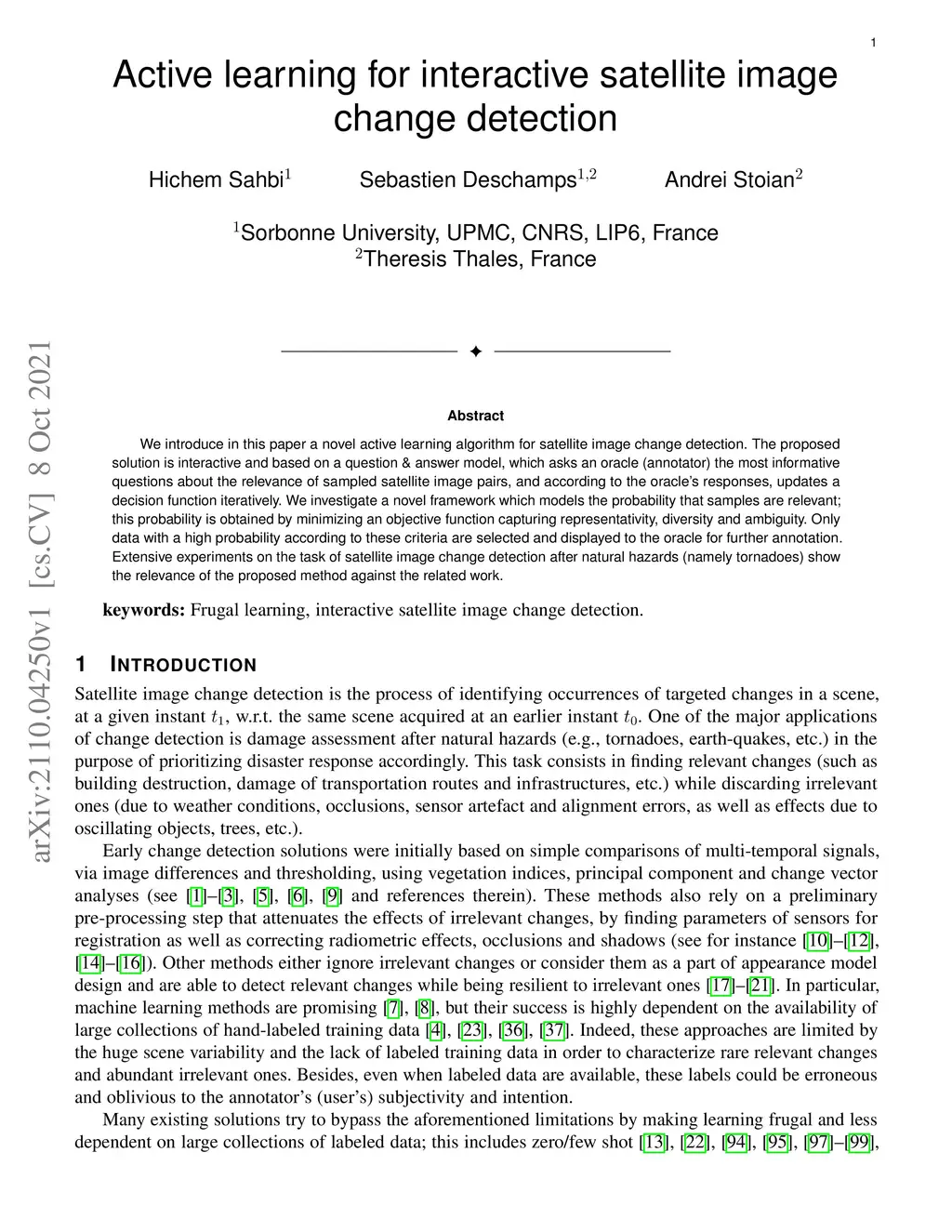 We introduce in this paper a novel active learning algorithm for satellite image change detection. The proposed solution is interactive and based on a question and answer model, which asks an oracle (annotator) the most informative questions about the relevance of sampled satellite image pairs, and according to the oracle's responses, updates a decision function iteratively. We investigate a novel framework which models the probability that samples are relevant; this probability is obtained by minimizing an objective function capturing representativity, diversity and ambiguity. Only data with a high probability according to these criteria are selected and displayed to the oracle for further annotation. Extensive experiments on the task of satellite image change detection after natural hazards (namely tornadoes) show the relevance of the proposed method against the related work.