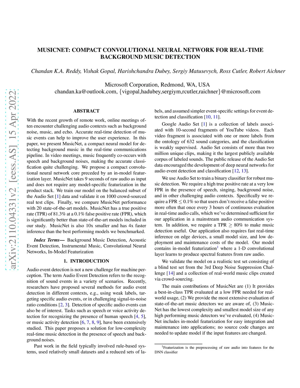 With the recent growth of remote work, online meetings often encounter challenging audio contexts such as background noise, music, and echo. Accurate real-time detection of music events can help to improve the user experience. In this paper, we present MusicNet, a compact neural model for detecting background music in the real-time communications pipeline. In video meetings, music frequently co-occurs with speech and background noises, making the accurate classification quite challenging. We propose a compact convolutional neural network core preceded by an in-model featurization layer. MusicNet takes 9 seconds of raw audio as input and does not require any model-specific featurization in the product stack. We train our model on the balanced subset of the Audio Set~\cite{gemmeke2017audio} data and validate it on 1000 crowd-sourced real test clips. Finally, we compare MusicNet performance with 20 state-of-the-art models. MusicNet has a true positive rate (TPR) of 81.3% at a 0.1% false positive rate (FPR), which is significantly better than state-of-the-art models included in our study. MusicNet is also 10x smaller and has 4x faster inference than the best performing models we benchmarked.