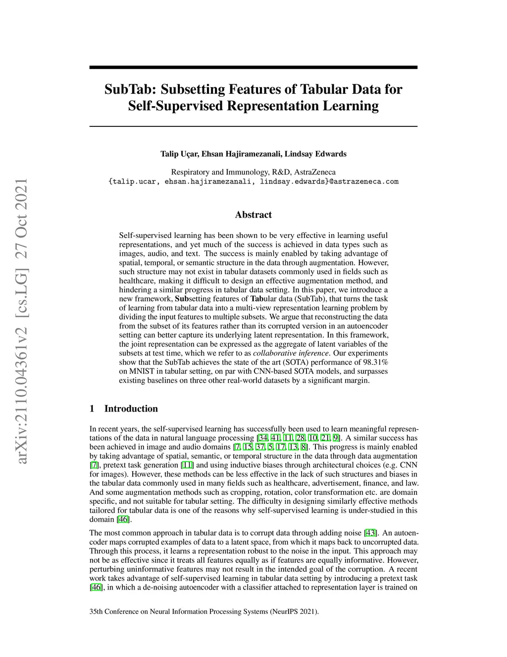 Self-supervised learning has been shown to be very effective in learning useful representations, and yet much of the success is achieved in data types such as images, audio, and text. The success is mainly enabled by taking advantage of spatial, temporal, or semantic structure in the data through augmentation. However, such structure may not exist in tabular datasets commonly used in fields such as healthcare, making it difficult to design an effective augmentation method, and hindering a similar progress in tabular data setting. In this paper, we introduce a new framework, Subsetting features of Tabular data (SubTab), that turns the task of learning from tabular data into a multi-view representation learning problem by dividing the input features to multiple subsets. We argue that reconstructing the data from the subset of its features rather than its corrupted version in an autoencoder setting can better capture its underlying latent representation. In this framework, the joint representation can be expressed as the aggregate of latent variables of the subsets at test time, which we refer to as collaborative inference. Our experiments show that the SubTab achieves the state of the art (SOTA) performance of 98.31% on MNIST in tabular setting, on par with CNN-based SOTA models, and surpasses existing baselines on three other real-world datasets by a significant margin.
