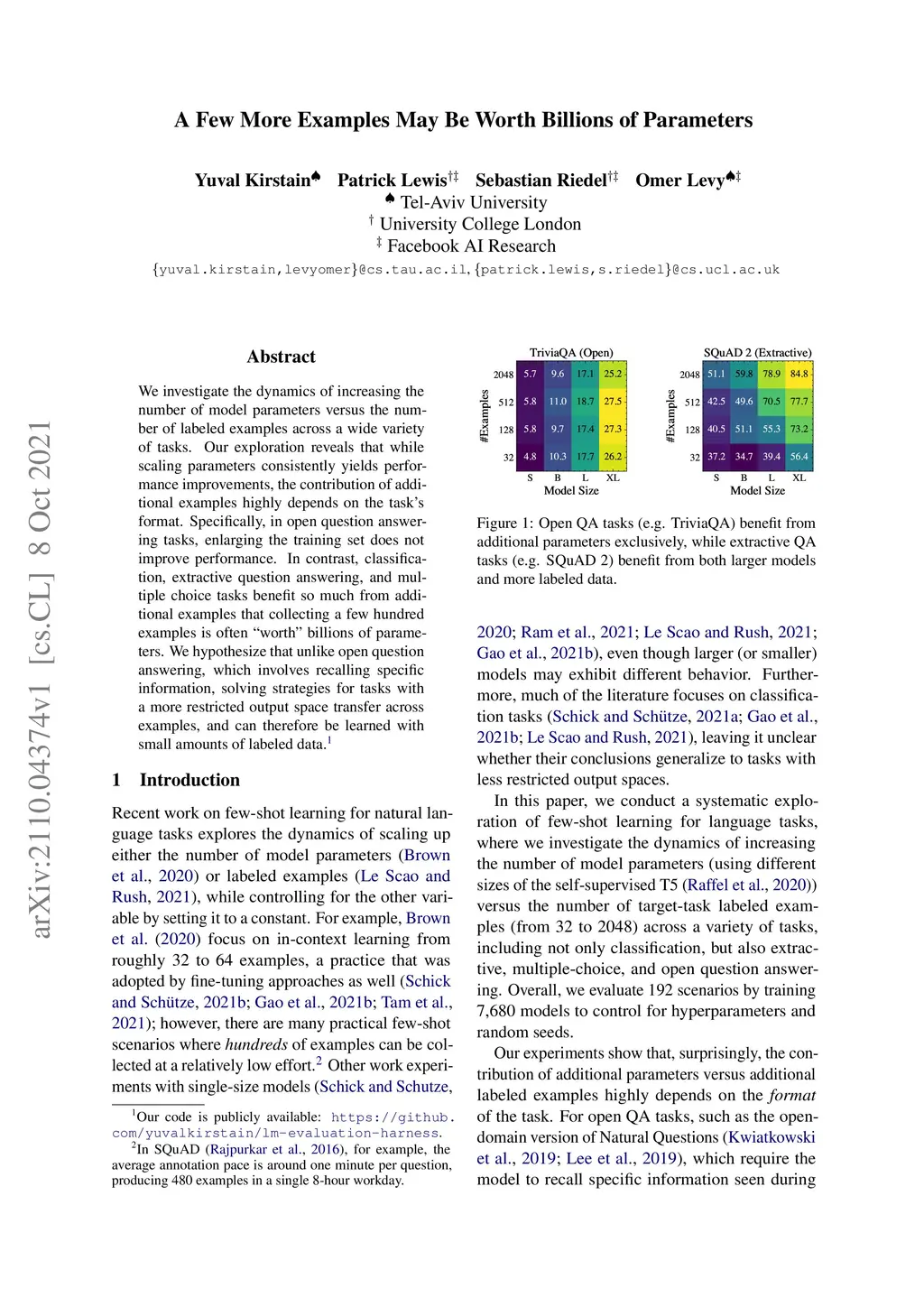 We investigate the dynamics of increasing the number of model parameters versus the number of labeled examples across a wide variety of tasks. Our exploration reveals that while scaling parameters consistently yields performance improvements, the contribution of additional examples highly depends on the task's format. Specifically, in open question answering tasks, enlarging the training set does not improve performance. In contrast, classification, extractive question answering, and multiple choice tasks benefit so much from additional examples that collecting a few hundred examples is often "worth" billions of parameters. We hypothesize that unlike open question answering, which involves recalling specific information, solving strategies for tasks with a more restricted output space transfer across examples, and can therefore be learned with small amounts of labeled data.