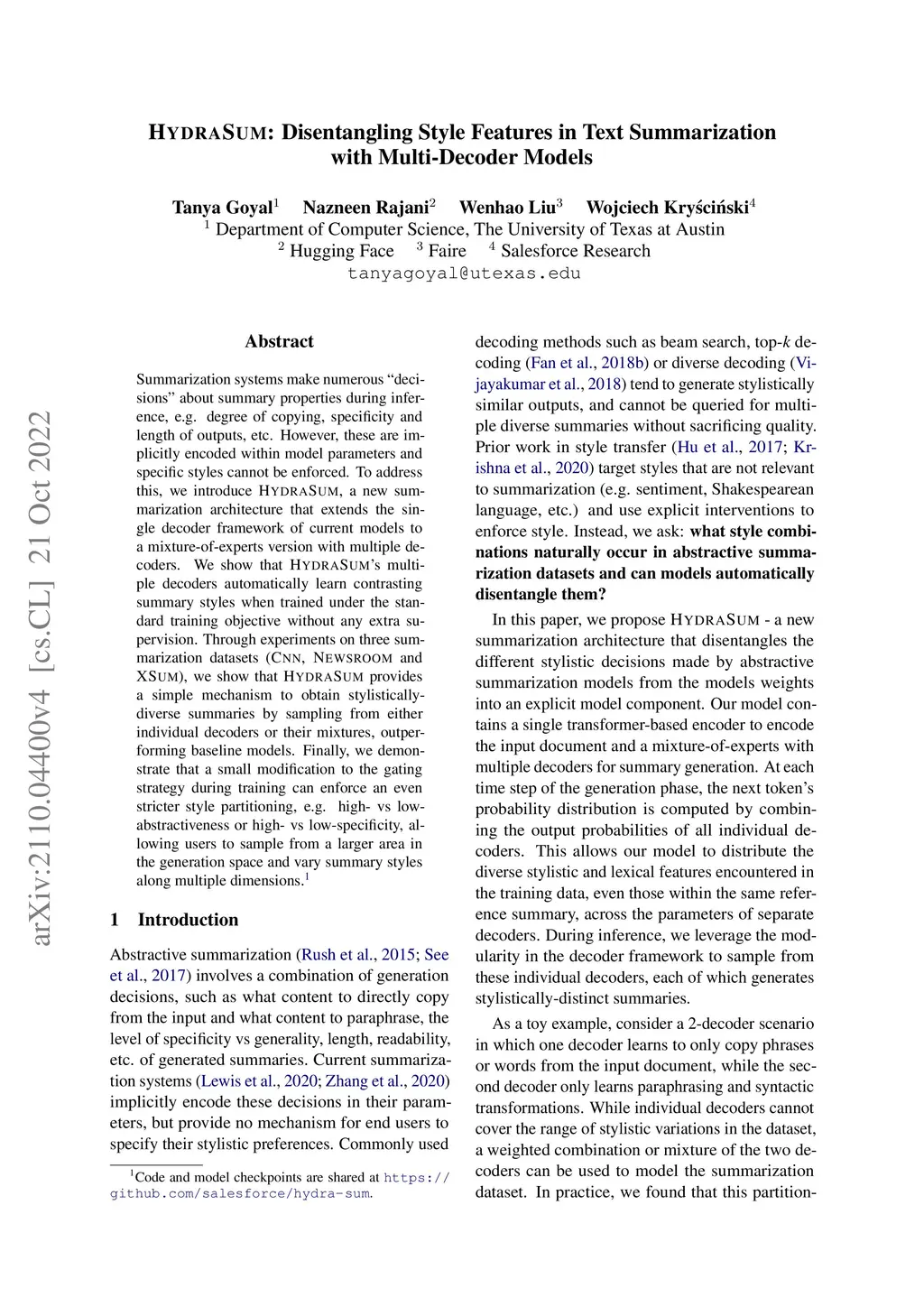 HydraSum: Disentangling Stylistic Features in Text Summarization using