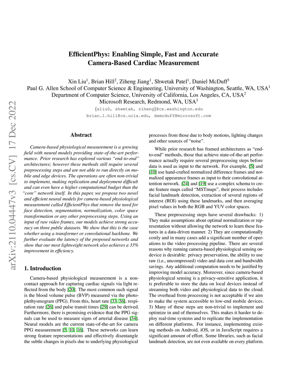 EfficientPhys: Enabling Simple, Fast and Accurate Camera-Based Vitals