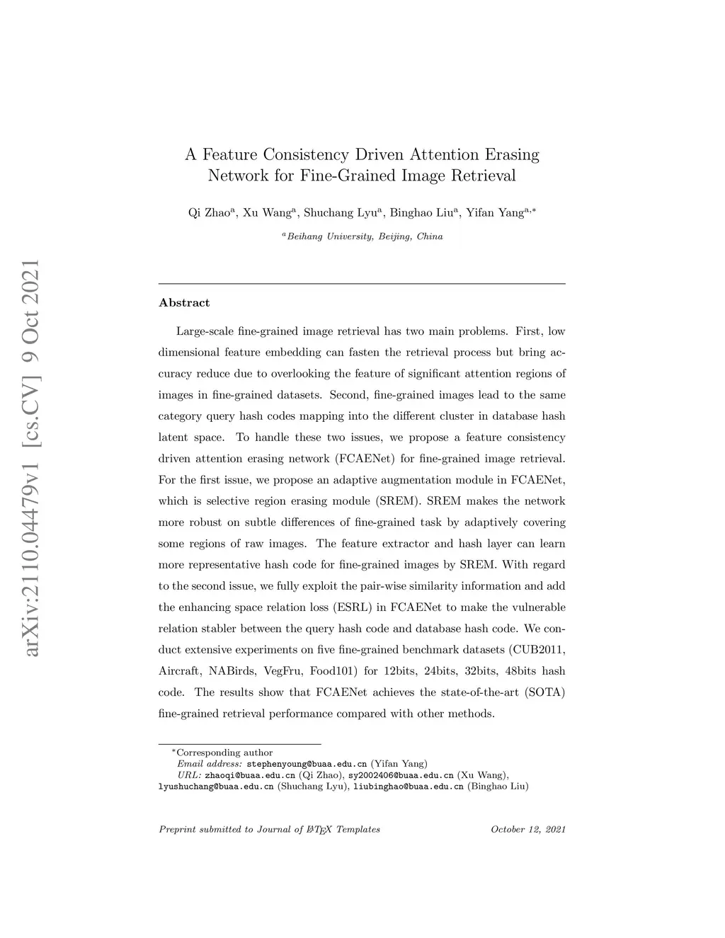 Large-scale fine-grained image retrieval has two main problems. First, low dimensional feature embedding can fasten the retrieval process but bring accuracy reduce due to overlooking the feature of significant attention regions of images in fine-grained datasets. Second, fine-grained images lead to the same category query hash codes mapping into the different cluster in database hash latent space. To handle these two issues, we propose a feature consistency driven attention erasing network (FCAENet) for fine-grained image retrieval. For the first issue, we propose an adaptive augmentation module in FCAENet, which is selective region erasing module (SREM). SREM makes the network more robust on subtle differences of fine-grained task by adaptively covering some regions of raw images. The feature extractor and hash layer can learn more representative hash code for fine-grained images by SREM. With regard to the second issue, we fully exploit the pair-wise similarity information and add the enhancing space relation loss (ESRL) in FCAENet to make the vulnerable relation stabler between the query hash code and database hash code. We conduct extensive experiments on five fine-grained benchmark datasets (CUB2011, Aircraft, NABirds, VegFru, Food101) for 12bits, 24bits, 32bits, 48bits hash code. The results show that FCAENet achieves the state-of-the-art (SOTA) fine-grained retrieval performance compared with other methods.