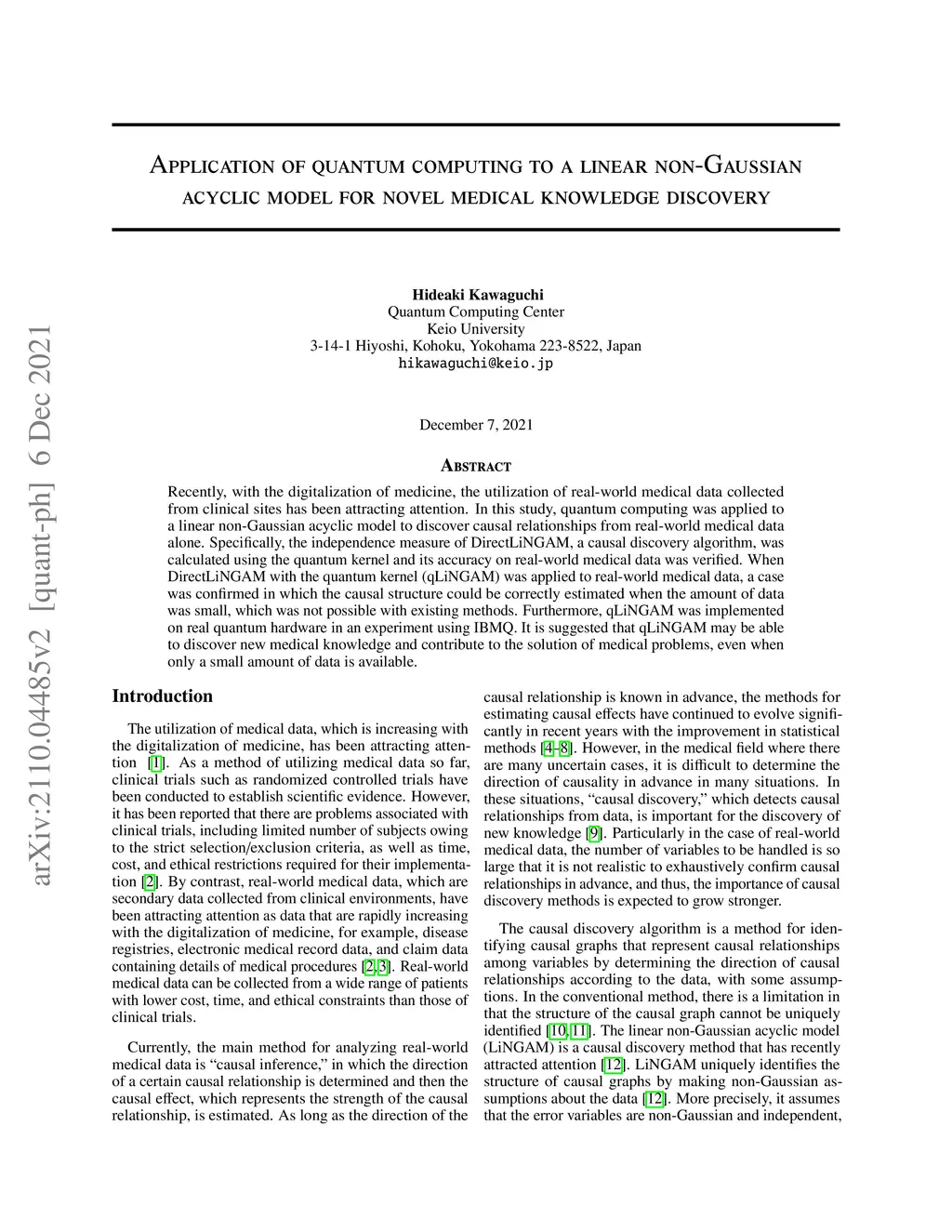 Recently, with the digitalization of medicine, the utilization of real-world medical data collected from clinical sites has been attracting attention. In this study, quantum computing was applied to a linear non-Gaussian acyclic model to discover causal relationships from real-world medical data alone. Specifically, the independence measure of DirectLiNGAM, a causal discovery algorithm, was calculated using the quantum kernel and its accuracy on real-world medical data was verified. When DirectLiNGAM with the quantum kernel (qLiNGAM) was applied to real-world medical data, a case was confirmed in which the causal structure could be correctly estimated when the amount of data was small, which was not possible with existing methods. Furthermore, qLiNGAM was implemented on real quantum hardware in an experiment using IBMQ. It is suggested that qLiNGAM may be able to discover new medical knowledge and contribute to the solution of medical problems, even when only a small amount of data is available.