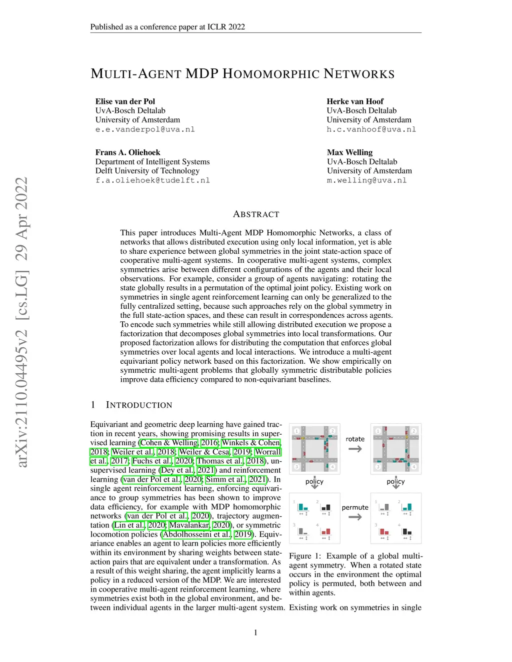 This paper introduces Multi-Agent MDP Homomorphic Networks, a class of networks that allows distributed execution using only local information, yet is able to share experience between global symmetries in the joint state-action space of cooperative multi-agent systems. In cooperative multi-agent systems, complex symmetries arise between different configurations of the agents and their local observations. For example, consider a group of agents navigating: rotating the state globally results in a permutation of the optimal joint policy. Existing work on symmetries in single agent reinforcement learning can only be generalized to the fully centralized setting, because such approaches rely on the global symmetry in the full state-action spaces, and these can result in correspondences across agents. To encode such symmetries while still allowing distributed execution we propose a factorization that decomposes global symmetries into local transformations. Our proposed factorization allows for distributing the computation that enforces global symmetries over local agents and local interactions. We introduce a multi-agent equivariant policy network based on this factorization. We show empirically on symmetric multi-agent problems that globally symmetric distributable policies improve data efficiency compared to non-equivariant baselines.