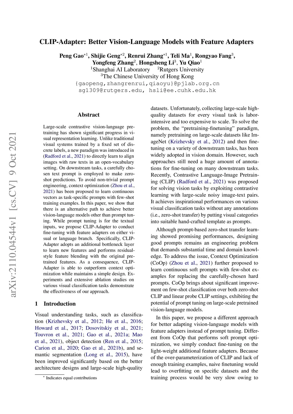 CLIP-Adapter: Better Vision-Language Models with Feature Adapters