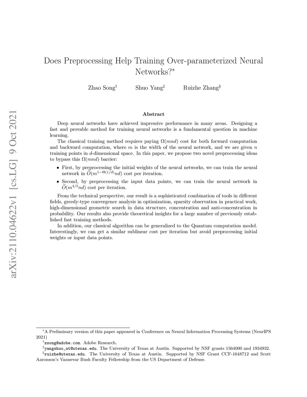 Deep neural networks have achieved impressive performance in many areas. Designing a fast and provable method for training neural networks is a fundamental question in machine learning. The classical training method requires paying cost for both forward computation and backward computation, where is the width of the neural network, and we are given training points in -dimensional space. In this paper, we propose two novel preprocessing ideas to bypass this barrier: First, by preprocessing the initial weights of the neural networks, we can train the neural network in cost per iteration. Second, by preprocessing the input data points, we can train the neural network in cost per iteration. From the technical perspective, our result is a sophisticated combination of tools in different fields, greedy-type convergence analysis in optimization, sparsity observation in practical work, high-dimensional geometric search in data structure, concentration and anti-concentration in probability. Our results also provide theoretical insights for a large number of previously established fast training methods. In addition, our classical algorithm can be generalized to the Quantum computation model. Interestingly, we can get a similar sublinear cost per iteration but avoid preprocessing initial weights or input data points.