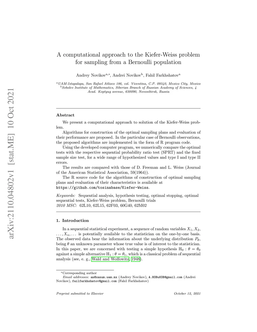 We present a computational approach to solution of the Kiefer-Weiss problem. Algorithms for construction of the optimal sampling plans and evaluation of their performance are proposed. In the particular case of Bernoulli observations, the proposed algorithms are implemented in the form of R program code. Using the developed computer program, we numerically compare the optimal tests with the respective sequential probability ratio test (SPRT) and the fixed sample size test, for a wide range of hypothesized values and type I and type II errors. The results are compared with those of D.~Freeman and L.~Weiss (Journal of the American Statistical Association, 59(1964)). The R source code for the algorithms of construction of optimal sampling plans and evaluation of their characteristics is available at https://github.com/tosinabase/Kiefer-Weiss.