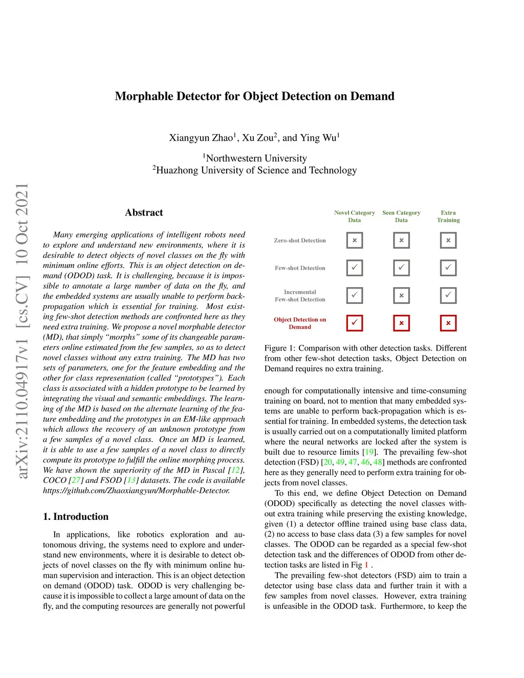 Many emerging applications of intelligent robots need to explore and understand new environments, where it is desirable to detect objects of novel classes on the fly with minimum online efforts. This is an object detection on demand (ODOD) task. It is challenging, because it is impossible to annotate a large number of data on the fly, and the embedded systems are usually unable to perform back-propagation which is essential for training. Most existing few-shot detection methods are confronted here as they need extra training. We propose a novel morphable detector (MD), that simply "morphs" some of its changeable parameters online estimated from the few samples, so as to detect novel classes without any extra training. The MD has two sets of parameters, one for the feature embedding and the other for class representation (called "prototypes"). Each class is associated with a hidden prototype to be learned by integrating the visual and semantic embeddings. The learning of the MD is based on the alternate learning of the feature embedding and the prototypes in an EM-like approach which allows the recovery of an unknown prototype from a few samples of a novel class. Once an MD is learned, it is able to use a few samples of a novel class to directly compute its prototype to fulfill the online morphing process. We have shown the superiority of the MD in Pascal, COCO and FSOD datasets. The code is available https://github.com/Zhaoxiangyun/Morphable-Detector.