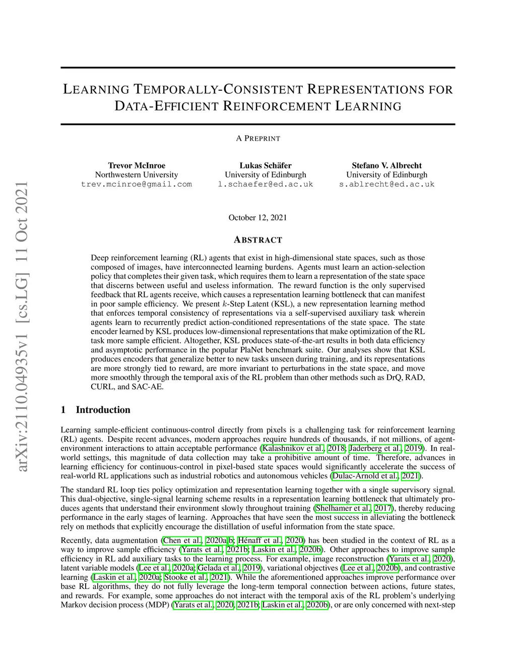 Deep reinforcement learning (RL) agents that exist in high-dimensional state spaces, such as those composed of images, have interconnected learning burdens. Agents must learn an action-selection policy that completes their given task, which requires them to learn a representation of the state space that discerns between useful and useless information. The reward function is the only supervised feedback that RL agents receive, which causes a representation learning bottleneck that can manifest in poor sample efficiency. We present -Step Latent (KSL), a new representation learning method that enforces temporal consistency of representations via a self-supervised auxiliary task wherein agents learn to recurrently predict action-conditioned representations of the state space. The state encoder learned by KSL produces low-dimensional representations that make optimization of the RL task more sample efficient. Altogether, KSL produces state-of-the-art results in both data efficiency and asymptotic performance in the popular PlaNet benchmark suite. Our analyses show that KSL produces encoders that generalize better to new tasks unseen during training, and its representations are more strongly tied to reward, are more invariant to perturbations in the state space, and move more smoothly through the temporal axis of the RL problem than other methods such as DrQ, RAD, CURL, and SAC-AE.