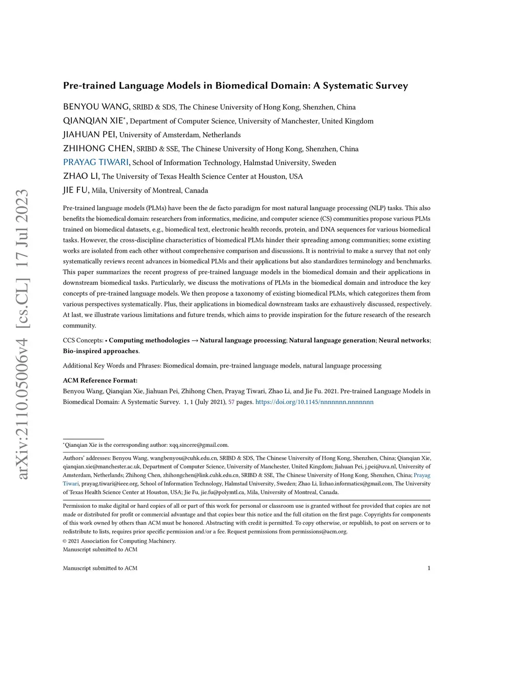Pre-trained language models (PLMs) have been the de facto paradigm for most natural language processing (NLP) tasks. This also benefits biomedical domain: researchers from informatics, medicine, and computer science (CS) communities propose various PLMs trained on biomedical datasets, e.g., biomedical text, electronic health records, protein, and DNA sequences for various biomedical tasks. However, the cross-discipline characteristics of biomedical PLMs hinder their spreading among communities; some existing works are isolated from each other without comprehensive comparison and discussions. It expects a survey that not only systematically reviews recent advances of biomedical PLMs and their applications but also standardizes terminology and benchmarks. In this paper, we summarize the recent progress of pre-trained language models in the biomedical domain and their applications in biomedical downstream tasks. Particularly, we discuss the motivations and propose a taxonomy of existing biomedical PLMs. Their applications in biomedical downstream tasks are exhaustively discussed. At last, we illustrate various limitations and future trends, which we hope can provide inspiration for the future research of the research community.