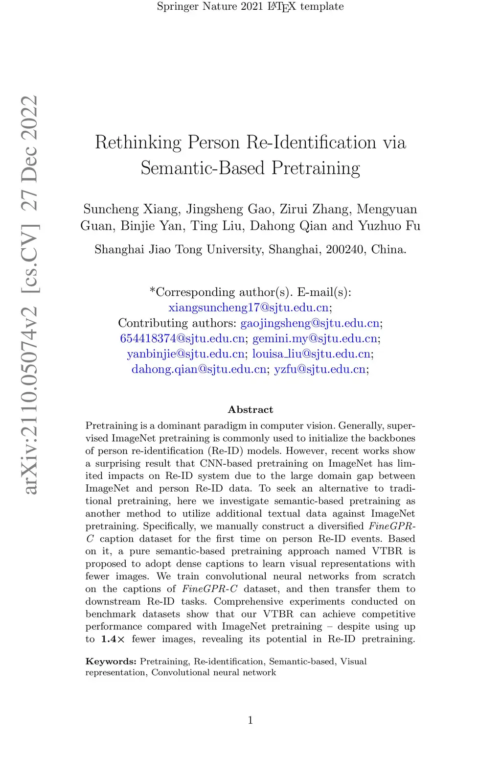 Pretraining is a dominant paradigm in computer vision. Generally, supervised ImageNet pretraining is commonly used to initialize the backbones of person re-identification (Re-ID) models. However, recent works show a surprising result that CNN-based pretraining on ImageNet has limited impacts on Re-ID system due to the large domain gap between ImageNet and person Re-ID data. To seek an alternative to traditional pretraining, here we investigate semantic-based pretraining as another method to utilize additional textual data against ImageNet pretraining. Specifically, we manually construct a diversified FineGPR-C caption dataset for the first time on person Re-ID events. Based on it, a pure semantic-based pretraining approach named VTBR is proposed to adopt dense captions to learn visual representations with fewer images. We train convolutional neural networks from scratch on the captions of FineGPR-C dataset, and then transfer them to downstream Re-ID tasks. Comprehensive experiments conducted on benchmark datasets show that our VTBR can achieve competitive performance compared with ImageNet pretraining - despite using up to 1.4x fewer images, revealing its potential in Re-ID pretraining.