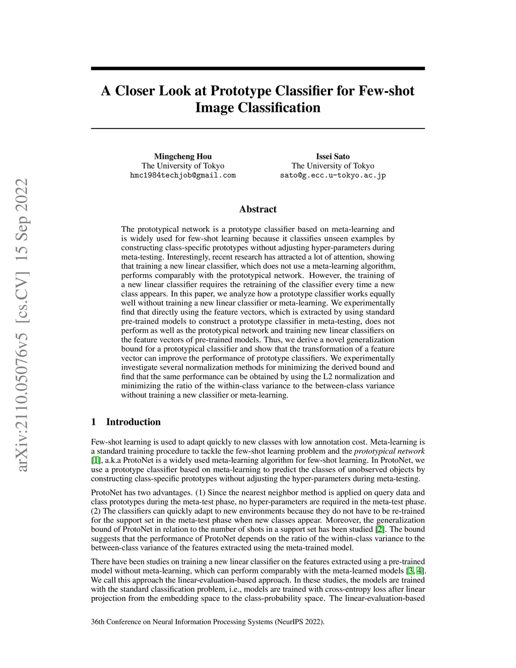 The prototypical network is a prototype classifier based on meta-learning and is widely used for few-shot learning because it classifies unseen examples by constructing class-specific prototypes without adjusting hyper-parameters during meta-testing. Interestingly, recent research has attracted a lot of attention, showing that training a new linear classifier, which does not use a meta-learning algorithm, performs comparably with the prototypical network. However, the training of a new linear classifier requires the retraining of the classifier every time a new class appears. In this paper, we analyze how a prototype classifier works equally well without training a new linear classifier or meta-learning. We experimentally find that directly using the feature vectors, which is extracted by using standard pre-trained models to construct a prototype classifier in meta-testing, does not perform as well as the prototypical network and training new linear classifiers on the feature vectors of pre-trained models. Thus, we derive a novel generalization bound for a prototypical classifier and show that the transformation of a feature vector can improve the performance of prototype classifiers. We experimentally investigate several normalization methods for minimizing the derived bound and find that the same performance can be obtained by using the L2 normalization and minimizing the ratio of the within-class variance to the between-class variance without training a new classifier or meta-learning.