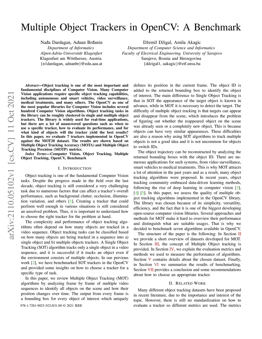 Object tracking is one of the most important and fundamental disciplines of Computer Vision. Many Computer Vision applications require specific object tracking capabilities, including autonomous and smart vehicles, video surveillance, medical treatments, and many others. The OpenCV as one of the most popular libraries for Computer Vision includes several hundred Computer Vision algorithms. Object tracking tasks in the library can be roughly clustered in single and multiple object trackers. The library is widely used for real-time applications, but there are a lot of unanswered questions such as when to use a specific tracker, how to evaluate its performance, and for what kind of objects will the tracker yield the best results? In this paper, we evaluate 7 trackers implemented in OpenCV against the MOT20 dataset. The results are shown based on Multiple Object Tracking Accuracy (MOTA) and Multiple Object Tracking Precision (MOTP) metrics.