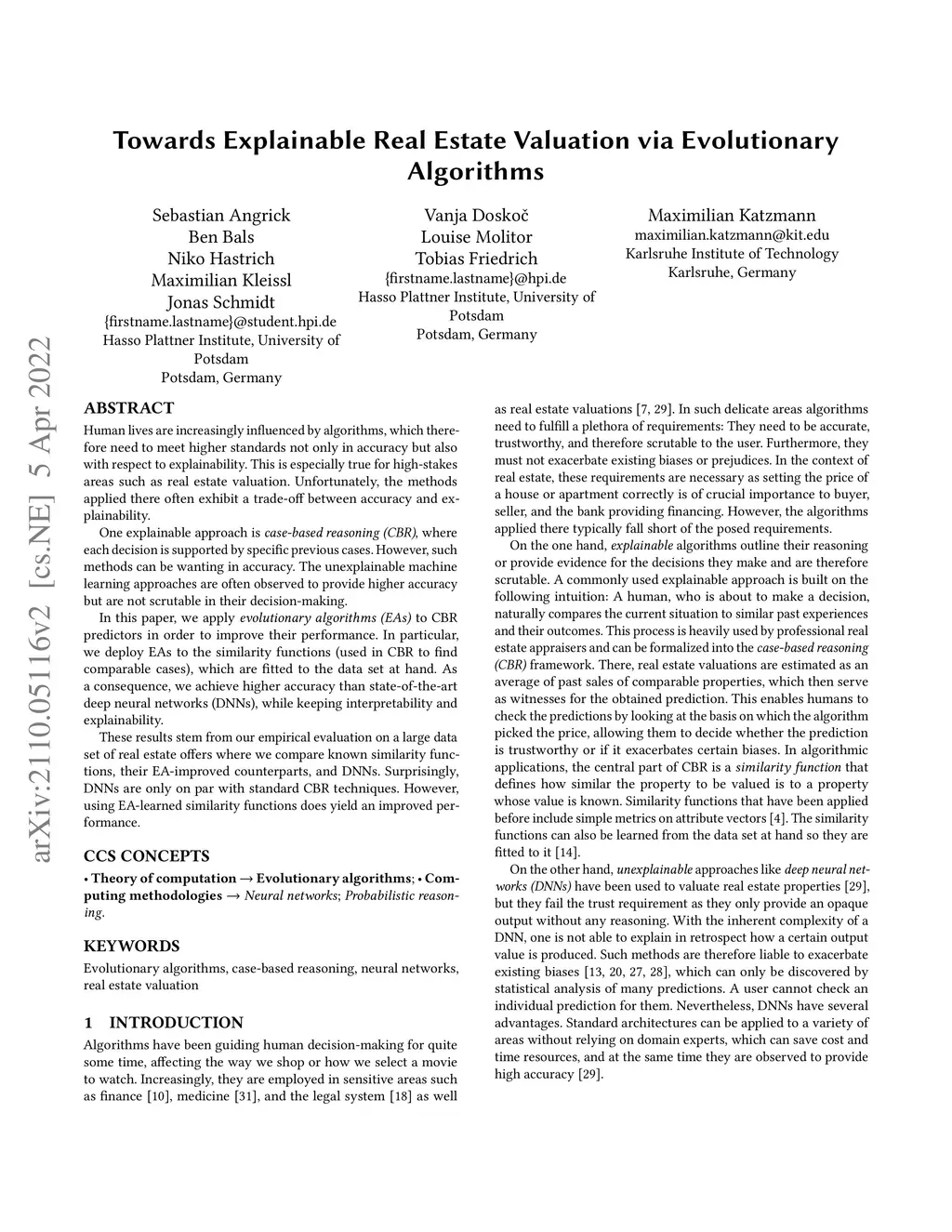 Human lives are increasingly influenced by algorithms, which therefore need to meet higher standards not only in accuracy but also with respect to explainability. This is especially true for high-stakes areas such as real estate valuation. Unfortunately, the methods applied there often exhibit a trade-off between accuracy and explainability. One explainable approach is case-based reasoning (CBR), where each decision is supported by specific previous cases. However, such methods can be wanting in accuracy. The unexplainable machine learning approaches are often observed to provide higher accuracy but are not scrutable in their decision-making. In this paper, we apply evolutionary algorithms (EAs) to CBR predictors in order to improve their performance. In particular, we deploy EAs to the similarity functions (used in CBR to find comparable cases), which are fitted to the data set at hand. As a consequence, we achieve higher accuracy than state-of-the-art deep neural networks (DNNs), while keeping interpretability and explainability. These results stem from our empirical evaluation on a large data set of real estate offers where we compare known similarity functions, their EA-improved counterparts, and DNNs. Surprisingly, DNNs are only on par with standard CBR techniques. However, using EA-learned similarity functions does yield an improved performance.