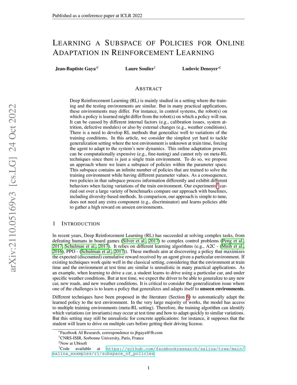 Learning a subspace of policies for online adaptation in Reinforcement