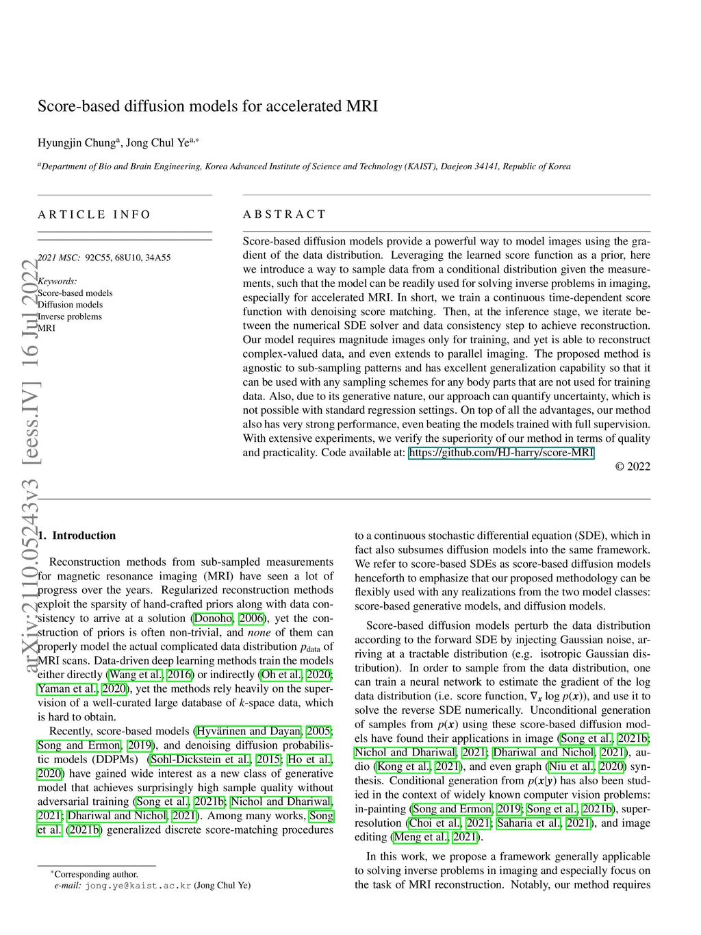 Score-based diffusion models provide a powerful way to model images using the gradient of the data distribution. Leveraging the learned score function as a prior, here we introduce a way to sample data from a conditional distribution given the measurements, such that the model can be readily used for solving inverse problems in imaging, especially for accelerated MRI. In short, we train a continuous time-dependent score function with denoising score matching. Then, at the inference stage, we iterate between numerical SDE solver and data consistency projection step to achieve reconstruction. Our model requires magnitude images only for training, and yet is able to reconstruct complex-valued data, and even extends to parallel imaging. The proposed method is agnostic to sub-sampling patterns, and can be used with any sampling schemes. Also, due to its generative nature, our approach can quantify uncertainty, which is not possible with standard regression settings. On top of all the advantages, our method also has very strong performance, even beating the models trained with full supervision. With extensive experiments, we verify the superiority of our method in terms of quality and practicality.