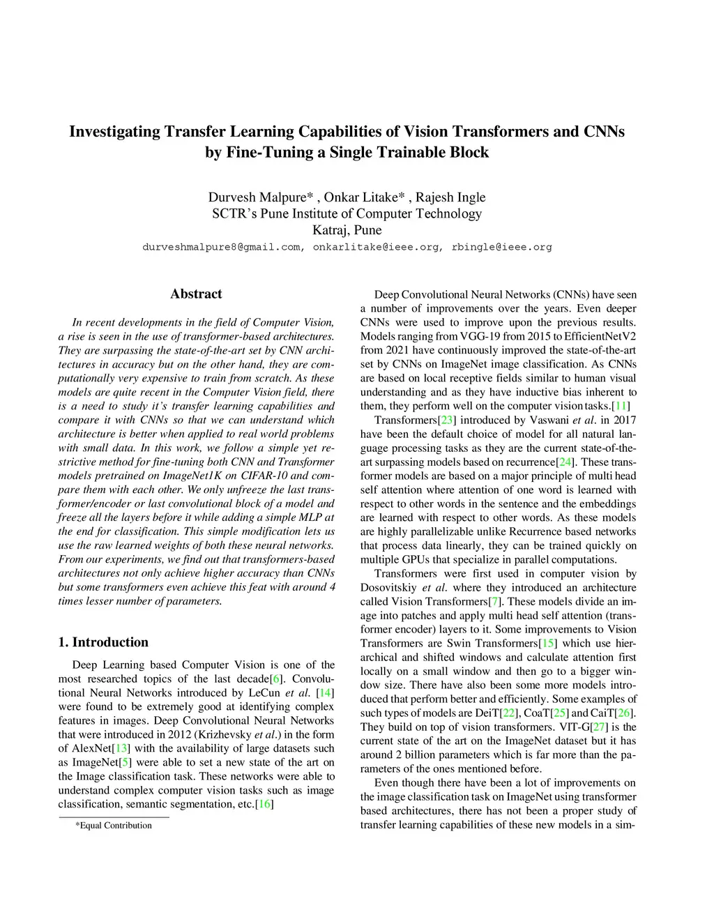 In recent developments in the field of Computer Vision, a rise is seen in the use of transformer-based architectures. They are surpassing the state-of-the-art set by CNN architectures in accuracy but on the other hand, they are computationally very expensive to train from scratch. As these models are quite recent in the Computer Vision field, there is a need to study it's transfer learning capabilities and compare it with CNNs so that we can understand which architecture is better when applied to real world problems with small data. In this work, we follow a simple yet restrictive method for fine-tuning both CNN and Transformer models pretrained on ImageNet1K on CIFAR-10 and compare them with each other. We only unfreeze the last transformer/encoder or last convolutional block of a model and freeze all the layers before it while adding a simple MLP at the end for classification. This simple modification lets us use the raw learned weights of both these neural networks. From our experiments, we find out that transformers-based architectures not only achieve higher accuracy than CNNs but some transformers even achieve this feat with around 4 times lesser number of parameters.