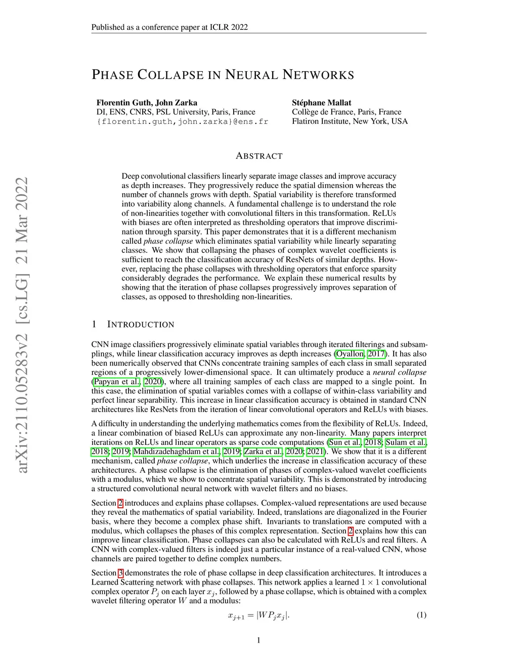 Deep convolutional classifiers linearly separate image classes and improve accuracy as depth increases. They progressively reduce the spatial dimension whereas the number of channels grows with depth. Spatial variability is therefore transformed into variability along channels. A fundamental challenge is to understand the role of non-linearities together with convolutional filters in this transformation. ReLUs with biases are often interpreted as thresholding operators that improve discrimination through sparsity. This paper demonstrates that it is a different mechanism called phase collapse which eliminates spatial variability while linearly separating classes. We show that collapsing the phases of complex wavelet coefficients is sufficient to reach the classification accuracy of ResNets of similar depths. However, replacing the phase collapses with thresholding operators that enforce sparsity considerably degrades the performance. We explain these numerical results by showing that the iteration of phase collapses progressively improves separation of classes, as opposed to thresholding non-linearities.