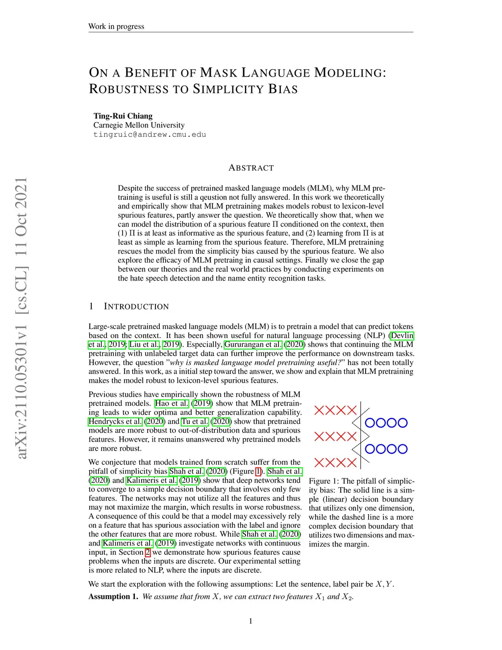 On a Benefit of Mask Language Modeling: Robustness to Simplicity Bias