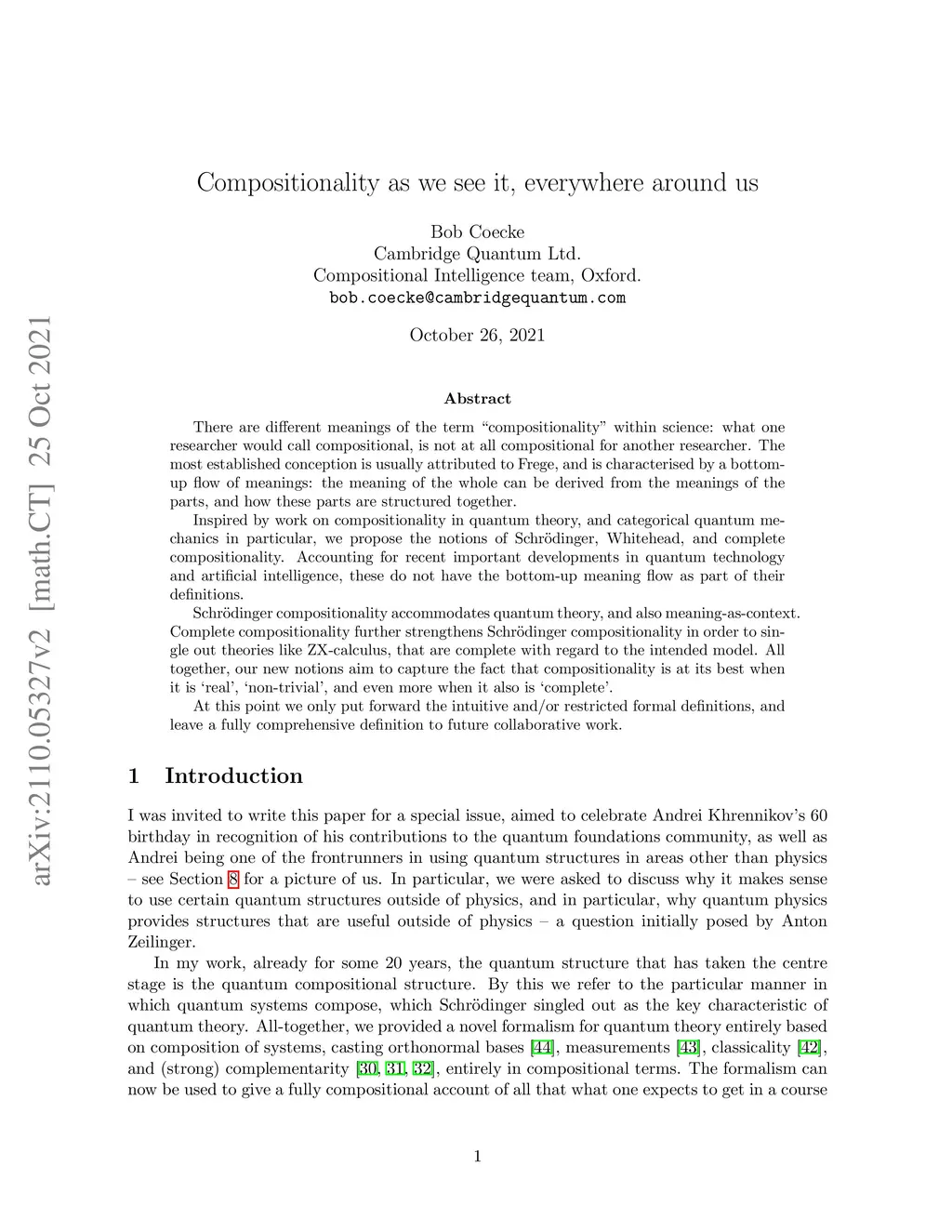There are different meanings of the term "compositionality" within science: what one researcher would call compositional, is not at all compositional for another researcher. The most established conception is usually attributed to Frege, and is characterised by a bottom-up flow of meanings: the meaning of the whole can be derived from the meanings of the parts, and how these parts are structured together. Inspired by work on compositionality in quantum theory, and categorical quantum mechanics in particular, we propose the notions of Schrodinger, Whitehead, and complete compositionality. Accounting for recent important developments in quantum technology and artificial intelligence, these do not have the bottom-up meaning flow as part of their definitions. Schrodinger compositionality accommodates quantum theory, and also meaning-as-context. Complete compositionality further strengthens Schrodinger compositionality in order to single out theories like ZX-calculus, that are complete with regard to the intended model. All together, our new notions aim to capture the fact that compositionality is at its best when it is `real', `non-trivial', and even more when it also is `complete'. At this point we only put forward the intuitive and/or restricted formal definitions, and leave a fully comprehensive definition to future collaborative work.
