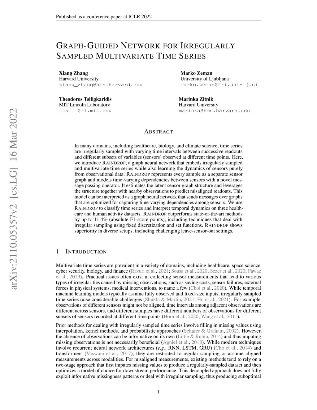 In many domains, including healthcare, biology, and climate science, time series are irregularly sampled with varying time intervals between successive readouts and different subsets of variables (sensors) observed at different time points. Here, we introduce RAINDROP, a graph neural network that embeds irregularly sampled and multivariate time series while also learning the dynamics of sensors purely from observational data. RAINDROP represents every sample as a separate sensor graph and models time-varying dependencies between sensors with a novel message passing operator. It estimates the latent sensor graph structure and leverages the structure together with nearby observations to predict misaligned readouts. This model can be interpreted as a graph neural network that sends messages over graphs that are optimized for capturing time-varying dependencies among sensors. We use RAINDROP to classify time series and interpret temporal dynamics on three healthcare and human activity datasets. RAINDROP outperforms state-of-the-art methods by up to 11.4% (absolute F1-score points), including techniques that deal with irregular sampling using fixed discretization and set functions. RAINDROP shows superiority in diverse setups, including challenging leave-sensor-out settings.