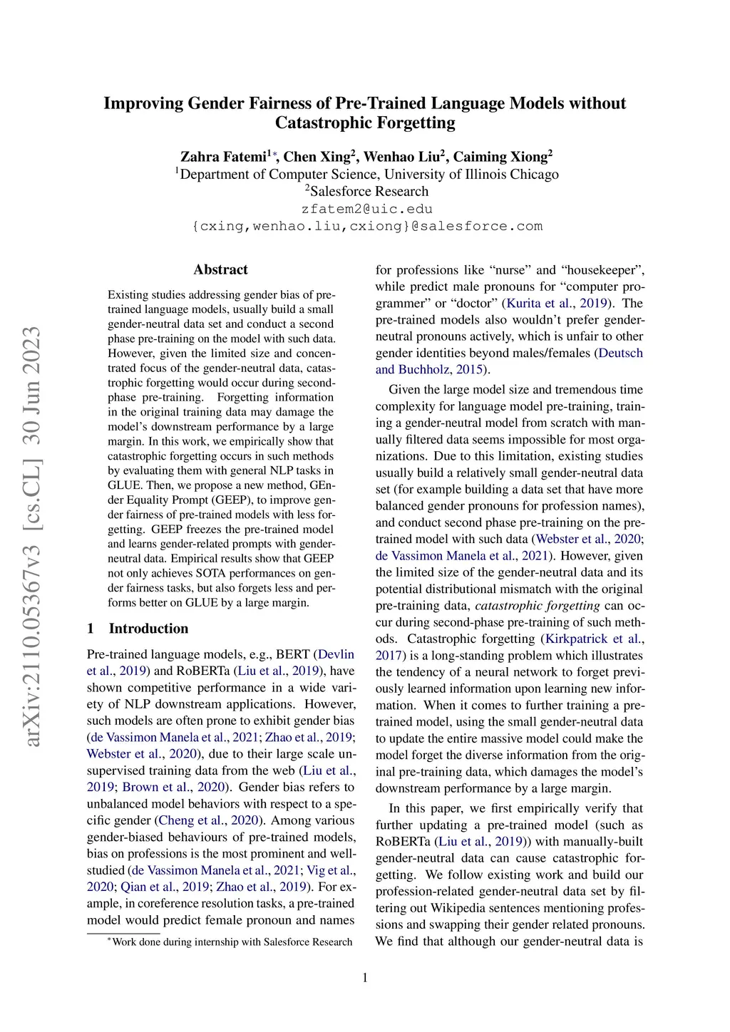 Existing studies addressing gender bias of pre-trained language models, usually build a small gender-neutral data set and conduct a second phase pre-training on the model with such data. However, given the limited size and concentrated focus of the gender-neutral data, catastrophic forgetting would occur during second-phase pre-training. Forgetting information in the original training data may damage the model's downstream performance by a large margin. In this work, we empirically show that catastrophic forgetting occurs in such methods by evaluating them with general NLP tasks in GLUE. Then, we propose a new method, GEnder Equality Prompt (GEEP), to improve gender fairness of pre-trained models with less forgetting. GEEP freezes the pre-trained model and learns gender-related prompts with gender-neutral data. Empirical results show that GEEP not only achieves SOTA performances on gender fairness tasks, but also forgets less and performs better on GLUE by a large margin.