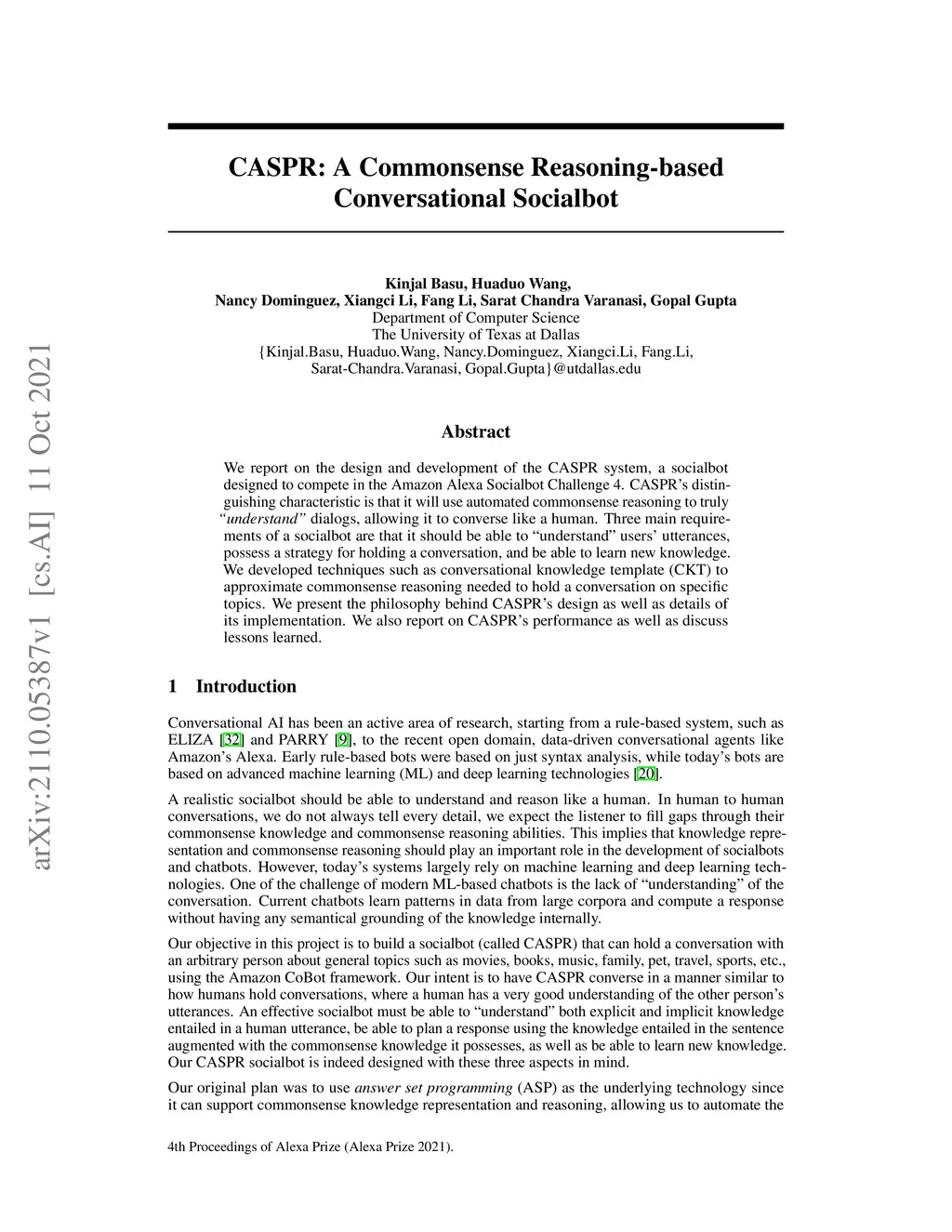 We report on the design and development of the CASPR system, a socialbot designed to compete in the Amazon Alexa Socialbot Challenge 4. CASPR's distinguishing characteristic is that it will use automated commonsense reasoning to truly "understand" dialogs, allowing it to converse like a human. Three main requirements of a socialbot are that it should be able to "understand" users' utterances, possess a strategy for holding a conversation, and be able to learn new knowledge. We developed techniques such as conversational knowledge template (CKT) to approximate commonsense reasoning needed to hold a conversation on specific topics. We present the philosophy behind CASPR's design as well as details of its implementation. We also report on CASPR's performance as well as discuss lessons learned.