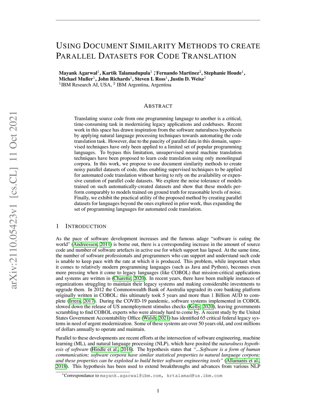 Using Document Similarity Methods to create Parallel Datasets for Code