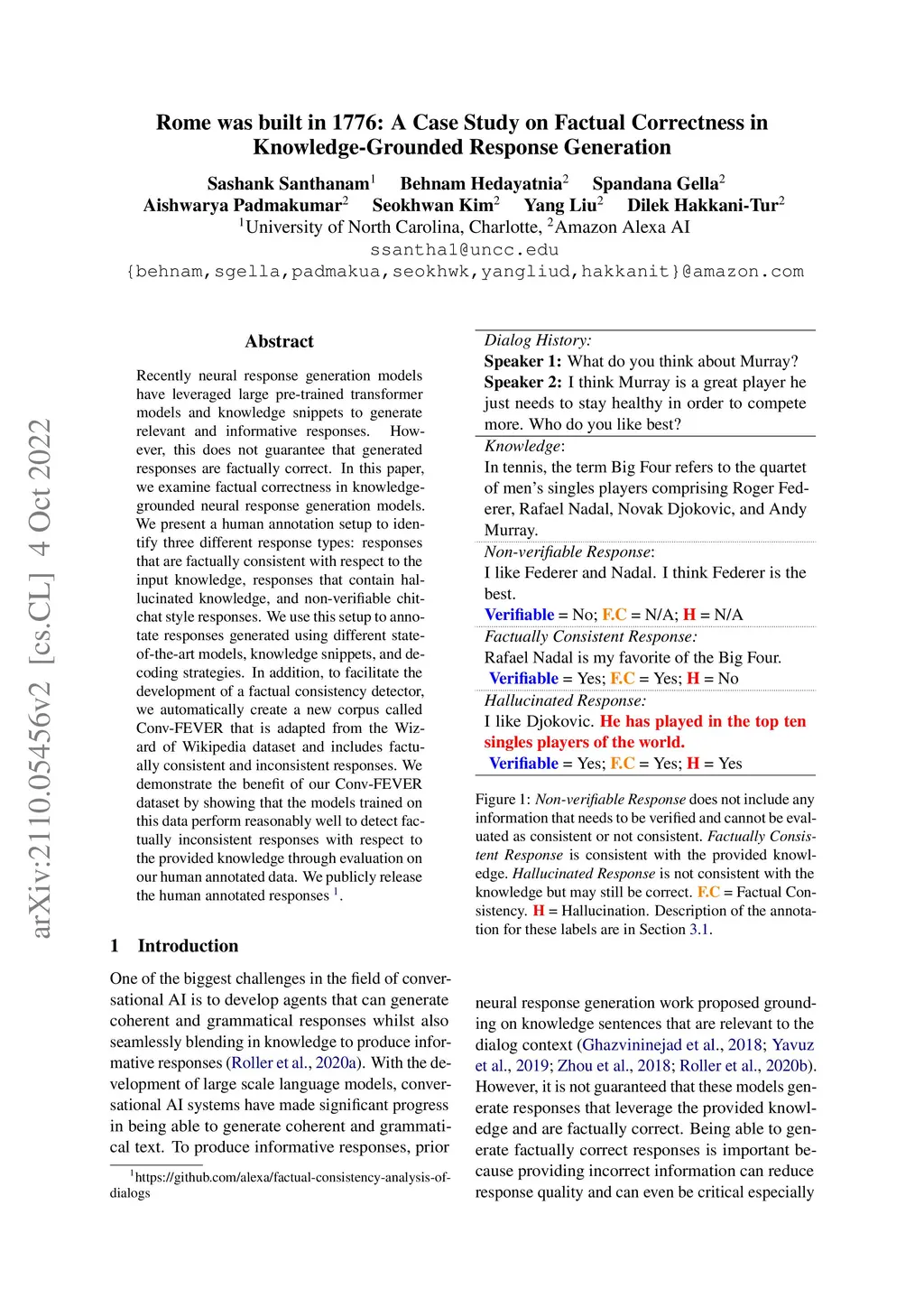 Recently neural response generation models have leveraged large pre-trained transformer models and knowledge snippets to generate relevant and informative responses. However, this does not guarantee that generated responses are factually correct. In this paper, we examine factual correctness in knowledge-grounded neural response generation models. We present a human annotation setup to identify three different response types: responses that are factually consistent with respect to the input knowledge, responses that contain hallucinated knowledge, and non-verifiable chitchat style responses. We use this setup to annotate responses generated using different stateof-the-art models, knowledge snippets, and decoding strategies. In addition, to facilitate the development of a factual consistency detector, we automatically create a new corpus called Conv-FEVER that is adapted from the Wizard of Wikipedia dataset and includes factually consistent and inconsistent responses. We demonstrate the benefit of our Conv-FEVER dataset by showing that the models trained on this data perform reasonably well to detect factually inconsistent responses with respect to the provided knowledge through evaluation on our human annotated data. We will release the Conv-FEVER dataset and the human annotated responses.