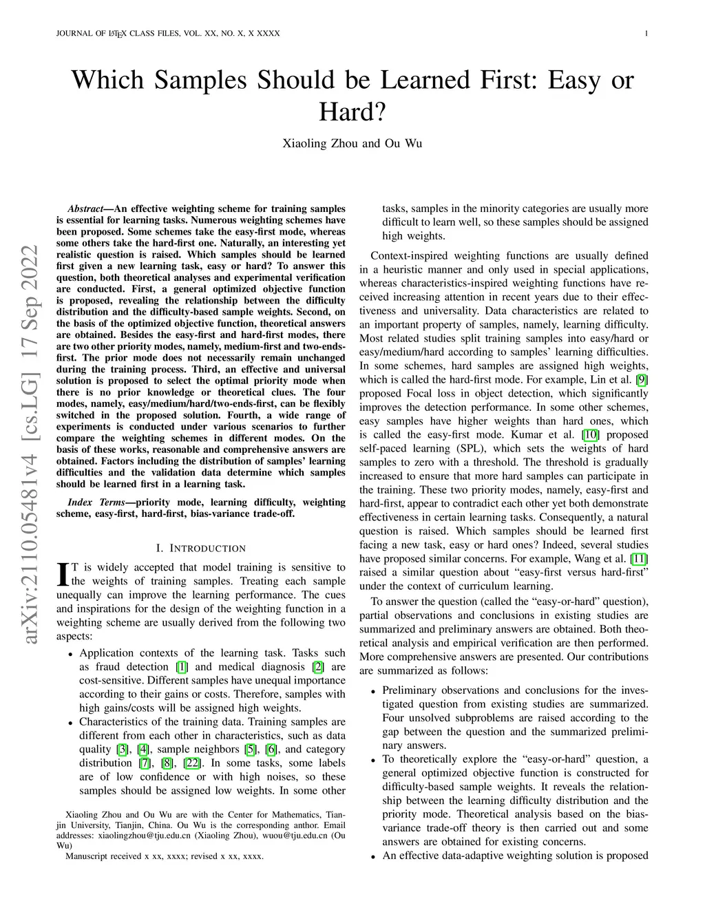 An effective weighting scheme for training samples is essential for learning tasks. Numerous weighting schemes have been proposed. Some schemes take the easy-first mode, whereas some others take the hard-first one. Naturally, an interesting yet realistic question is raised. Which samples should be learned first given a new learning task, easy or hard? To answer this question, both theoretical analyses and experimental verification are conducted. First, a general optimized objective function is proposed, revealing the relationship between the difficulty distribution and the difficulty-based sample weights. Second, on the basis of the optimized objective function, theoretical answers are obtained. Besides the easy-first and hard-first modes, there are two other priority modes, namely, medium-first and two-ends-first. The prior mode does not necessarily remain unchanged during the training process. Third, an effective and universal solution is proposed to select the optimal priority mode when there is no prior knowledge or theoretical clues. The four modes, namely, easy/medium/hard/two-ends-first, can be flexibly switched in the proposed solution. Fourth, a wide range of experiments is conducted under various scenarios to further compare the weighting schemes in different modes. On the basis of these works, reasonable and comprehensive answers are obtained. Factors including the distribution of samples' learning difficulties and the validation data determine which samples should be learned first in a learning task.
