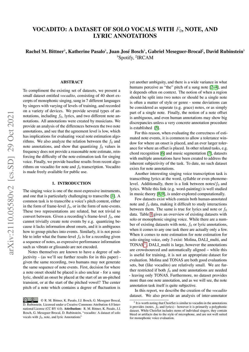 To compliment the existing set of datasets, we present a small dataset entitled vocadito, consisting of 40 short excerpts of monophonic singing, sung in 7 different languages by singers with varying of levels of training, and recorded on a variety of devices. We provide several types of annotations, including , lyrics, and two different note annotations. All annotations were created by musicians. We provide an analysis of the differences between the two note annotations, and see that the agreement level is low, which has implications for evaluating vocal note estimation algorithms. We also analyze the relation between the and note annotations, and show that quantizing values in frequency does not provide a reasonable note estimate, reinforcing the difficulty of the note estimation task for singing voice. Finally, we provide baseline results from recent algorithms on vocadito for note and transcription. Vocadito is made freely available for public use.