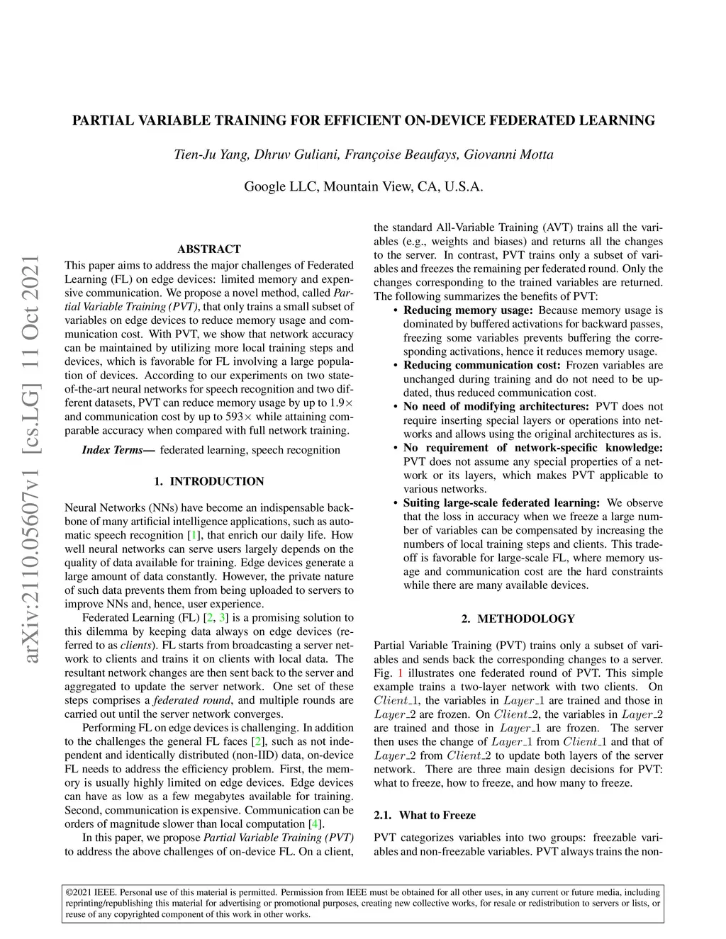 This paper aims to address the major challenges of Federated Learning (FL) on edge devices: limited memory and expensive communication. We propose a novel method, called Partial Variable Training (PVT), that only trains a small subset of variables on edge devices to reduce memory usage and communication cost. With PVT, we show that network accuracy can be maintained by utilizing more local training steps and devices, which is favorable for FL involving a large population of devices. According to our experiments on two state-of-the-art neural networks for speech recognition and two different datasets, PVT can reduce memory usage by up to 1.9 and communication cost by up to 593 while attaining comparable accuracy when compared with full network training.