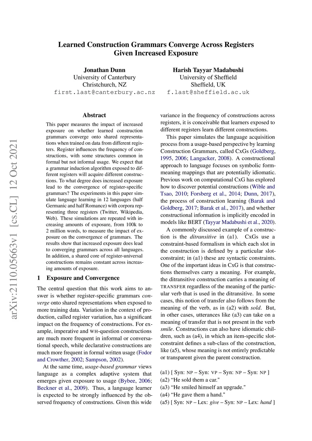 This paper measures the impact of increased exposure on whether learned construction grammars converge onto shared representations when trained on data from different registers. Register influences the frequency of constructions, with some structures common in formal but not informal usage. We expect that a grammar induction algorithm exposed to different registers will acquire different constructions. To what degree does increased exposure lead to the convergence of register-specific grammars? The experiments in this paper simulate language learning in 12 languages (half Germanic and half Romance) with corpora representing three registers (Twitter, Wikipedia, Web). These simulations are repeated with increasing amounts of exposure, from 100k to 2 million words, to measure the impact of exposure on the convergence of grammars. The results show that increased exposure does lead to converging grammars across all languages. In addition, a shared core of register-universal constructions remains constant across increasing amounts of exposure.