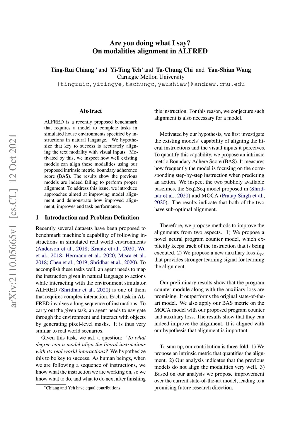 ALFRED is a recently proposed benchmark that requires a model to complete tasks in simulated house environments specified by instructions in natural language. We hypothesize that key to success is accurately aligning the text modality with visual inputs. Motivated by this, we inspect how well existing models can align these modalities using our proposed intrinsic metric, boundary adherence score (BAS). The results show the previous models are indeed failing to perform proper alignment. To address this issue, we introduce approaches aimed at improving model alignment and demonstrate how improved alignment, improves end task performance.