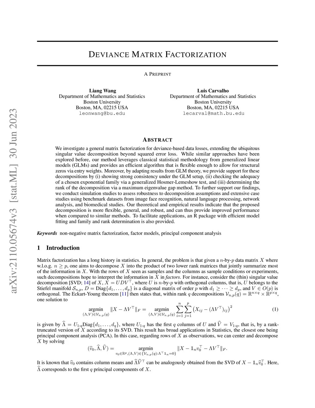 We investigate a general matrix factorization for deviance-based data losses, extending the ubiquitous singular value decomposition beyond squared error loss. While similar approaches have been explored before, our method leverages classical statistical methodology from generalized linear models (GLMs) and provides an efficient algorithm that is flexible enough to allow for structural zeros via entry weights. Moreover, by adapting results from GLM theory, we provide support for these decompositions by (i) showing strong consistency under the GLM setup, (ii) checking the adequacy of a chosen exponential family via a generalized Hosmer-Lemeshow test, and (iii) determining the rank of the decomposition via a maximum eigenvalue gap method. To further support our findings, we conduct simulation studies to assess robustness to decomposition assumptions and extensive case studies using benchmark datasets from image face recognition, natural language processing, network analysis, and biomedical studies. Our theoretical and empirical results indicate that the proposed decomposition is more flexible, general, and robust, and can thus provide improved performance when compared to similar methods. To facilitate applications, an R package with efficient model fitting and family and rank determination is also provided.