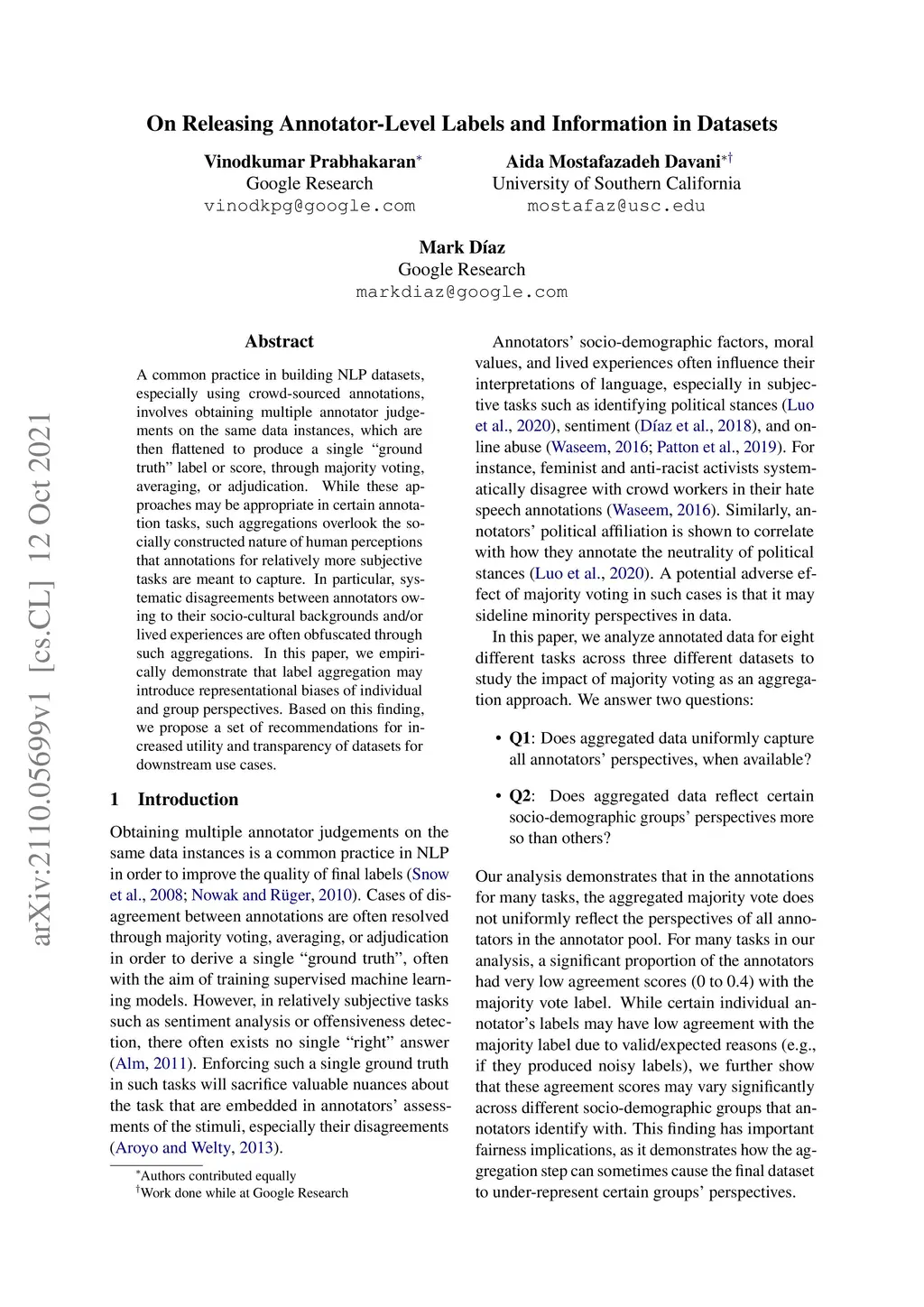 A common practice in building NLP datasets, especially using crowd-sourced annotations, involves obtaining multiple annotator judgements on the same data instances, which are then flattened to produce a single "ground truth" label or score, through majority voting, averaging, or adjudication. While these approaches may be appropriate in certain annotation tasks, such aggregations overlook the socially constructed nature of human perceptions that annotations for relatively more subjective tasks are meant to capture. In particular, systematic disagreements between annotators owing to their socio-cultural backgrounds and/or lived experiences are often obfuscated through such aggregations. In this paper, we empirically demonstrate that label aggregation may introduce representational biases of individual and group perspectives. Based on this finding, we propose a set of recommendations for increased utility and transparency of datasets for downstream use cases.
