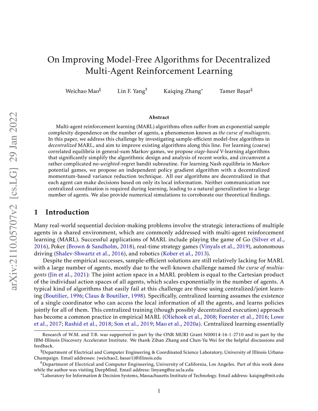 Multi-agent reinforcement learning (MARL) algorithms often suffer from an exponential sample complexity dependence on the number of agents, a phenomenon known as \emph{the curse of multiagents}. In this paper, we address this challenge by investigating sample-efficient model-free algorithms in \emph{decentralized} MARL, and aim to improve existing algorithms along this line. For learning (coarse) correlated equilibria in general-sum Markov games, we propose \emph{stage-based} V-learning algorithms that significantly simplify the algorithmic design and analysis of recent works, and circumvent a rather complicated no-\emph{weighted}-regret bandit subroutine. For learning Nash equilibria in Markov potential games, we propose an independent policy gradient algorithm with a decentralized momentum-based variance reduction technique. All our algorithms are decentralized in that each agent can make decisions based on only its local information. Neither communication nor centralized coordination is required during learning, leading to a natural generalization to a large number of agents. We also provide numerical simulations to corroborate our theoretical findings.