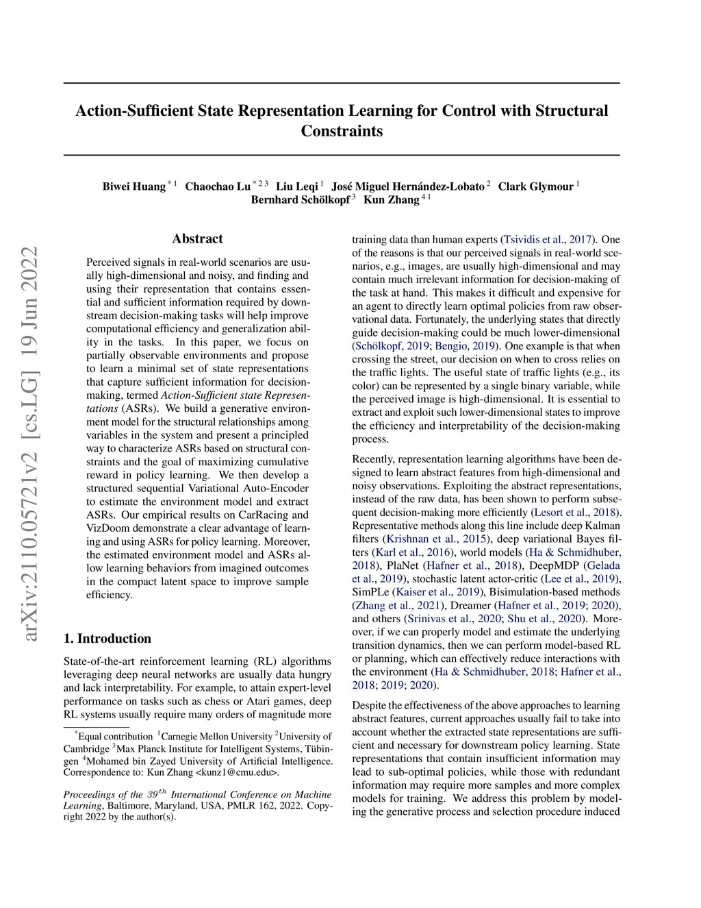 Perceived signals in real-world scenarios are usually high-dimensional and noisy, and finding and using their representation that contains essential and sufficient information required by downstream decision-making tasks will help improve computational efficiency and generalization ability in the tasks. In this paper, we focus on partially observable environments and propose to learn a minimal set of state representations that capture sufficient information for decision-making, termed \textit{Action-Sufficient state Representations} (ASRs). We build a generative environment model for the structural relationships among variables in the system and present a principled way to characterize ASRs based on structural constraints and the goal of maximizing cumulative reward in policy learning. We then develop a structured sequential Variational Auto-Encoder to estimate the environment model and extract ASRs. Our empirical results on CarRacing and VizDoom demonstrate a clear advantage of learning and using ASRs for policy learning. Moreover, the estimated environment model and ASRs allow learning behaviors from imagined outcomes in the compact latent space to improve sample efficiency.