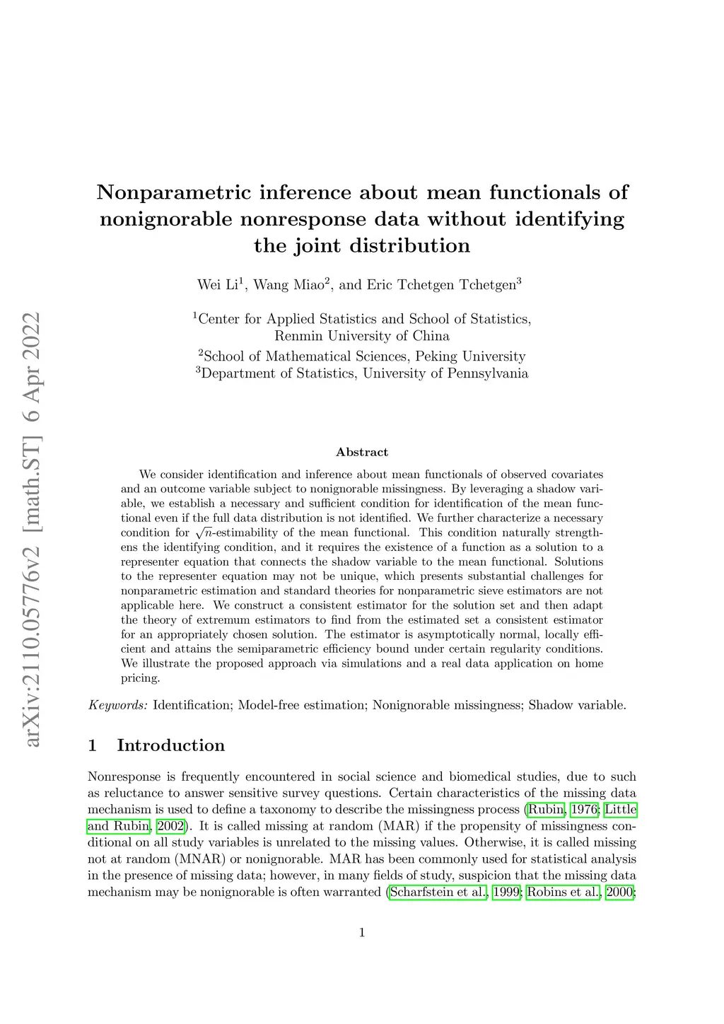 We consider identification and inference about mean functionals of observed covariates and an outcome variable subject to nonignorable missingness. By leveraging a shadow variable, we establish a necessary and sufficient condition for identification of the mean functional even if the full data distribution is not identified. We further characterize a necessary condition for -estimability of the mean functional. This condition naturally strengthens the identifying condition, and it requires the existence of a function as a solution to a representer equation that connects the shadow variable to the mean functional. Solutions to the representer equation may not be unique, which presents substantial challenges for nonparametric estimation and standard theories for nonparametric sieve estimators are not applicable here. We construct a consistent estimator for the solution set and then adapt the theory of extremum estimators to find from the estimated set a consistent estimator for an appropriately chosen solution. The estimator is asymptotically normal, locally efficient and attains the semiparametric efficiency bound under certain regularity conditions. We illustrate the proposed approach via simulations and a real data application on home pricing.