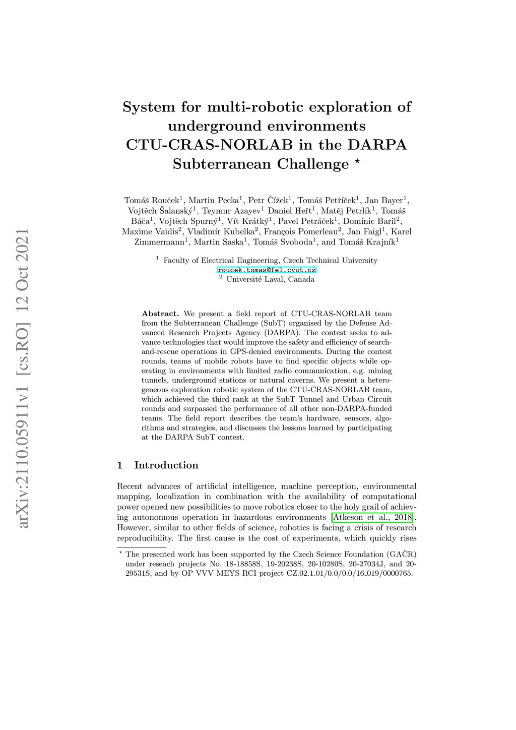 CTU-CRAS-NORLAB in the DARPA Subterranean Challenge