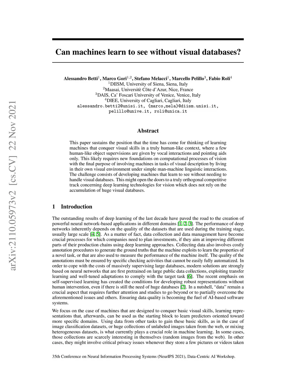 This paper sustains the position that the time has come for thinking of learning machines that conquer visual skills in a truly human-like context, where a few human-like object supervisions are given by vocal interactions and pointing aids only. This likely requires new foundations on computational processes of vision with the final purpose of involving machines in tasks of visual description by living in their own visual environment under simple man-machine linguistic interactions. The challenge consists of developing machines that learn to see without needing to handle visual databases. This might open the doors to a truly orthogonal competitive track concerning deep learning technologies for vision which does not rely on the accumulation of huge visual databases.