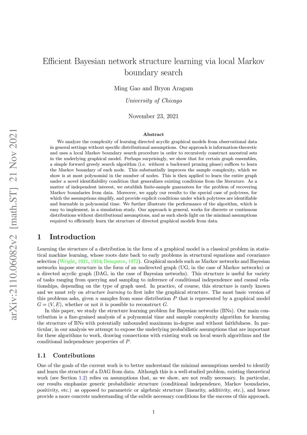 We analyze the complexity of learning directed acyclic graphical models from observational data in general settings without specific distributional assumptions. Our approach is information-theoretic and uses a local Markov boundary search procedure in order to recursively construct ancestral sets in the underlying graphical model. Perhaps surprisingly, we show that for certain graph ensembles, a simple forward greedy search algorithm (i.e. without a backward pruning phase) suffices to learn the Markov boundary of each node. This substantially improves the sample complexity, which we show is at most polynomial in the number of nodes. This is then applied to learn the entire graph under a novel identifiability condition that generalizes existing conditions from the literature. As a matter of independent interest, we establish finite-sample guarantees for the problem of recovering Markov boundaries from data. Moreover, we apply our results to the special case of polytrees, for which the assumptions simplify, and provide explicit conditions under which polytrees are identifiable and learnable in polynomial time. We further illustrate the performance of the algorithm, which is easy to implement, in a simulation study. Our approach is general, works for discrete or continuous distributions without distributional assumptions, and as such sheds light on the minimal assumptions required to efficiently learn the structure of directed graphical models from data.