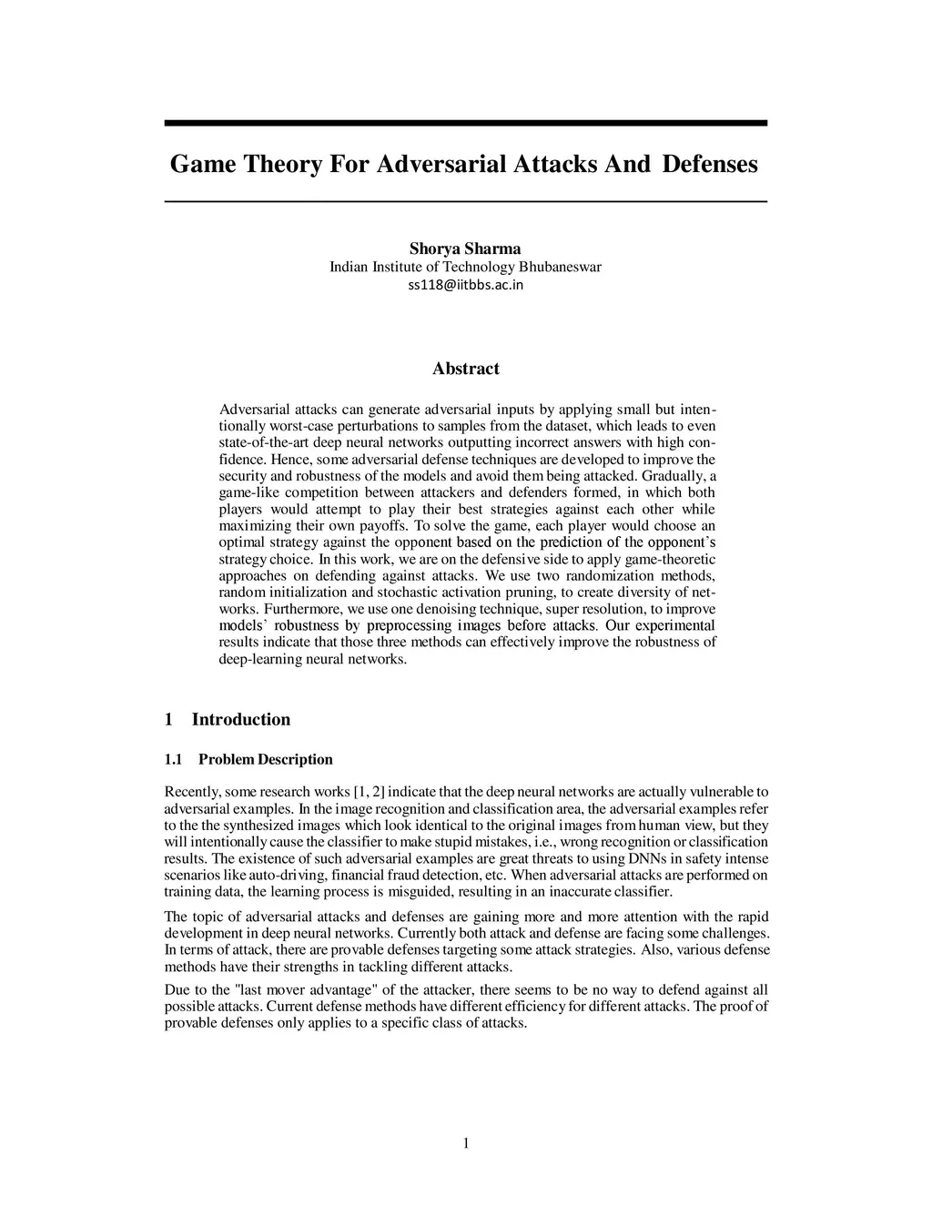 Adversarial attacks can generate adversarial inputs by applying small but intentionally worst-case perturbations to samples from the dataset, which leads to even state-of-the-art deep neural networks outputting incorrect answers with high confidence. Hence, some adversarial defense techniques are developed to improve the security and robustness of the models and avoid them being attacked. Gradually, a game-like competition between attackers and defenders formed, in which both players would attempt to play their best strategies against each other while maximizing their own payoffs. To solve the game, each player would choose an optimal strategy against the opponent based on the prediction of the opponent's strategy choice. In this work, we are on the defensive side to apply game-theoretic approaches on defending against attacks. We use two randomization methods, random initialization and stochastic activation pruning, to create diversity of networks. Furthermore, we use one denoising technique, super resolution, to improve models' robustness by preprocessing images before attacks. Our experimental results indicate that those three methods can effectively improve the robustness of deep-learning neural networks.