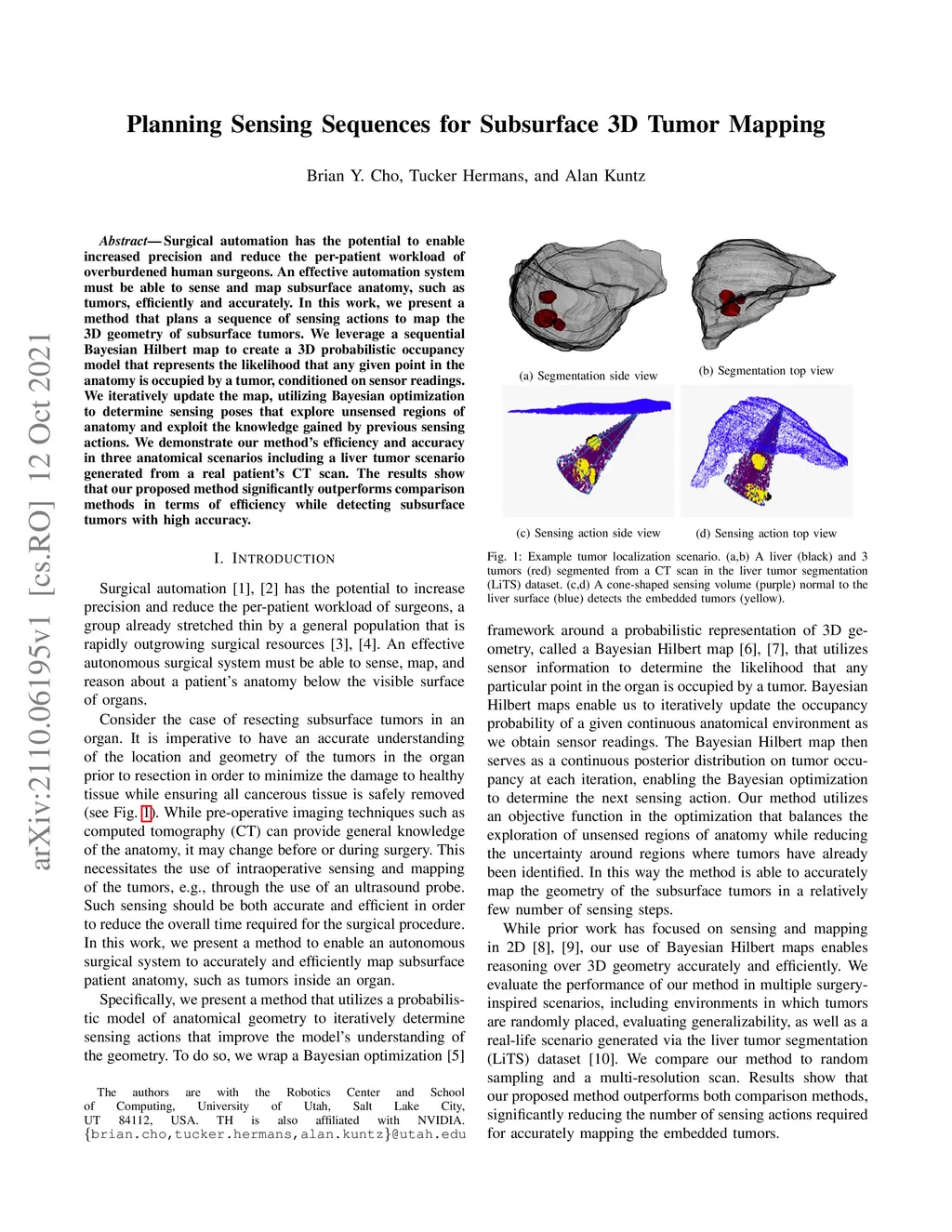 Surgical automation has the potential to enable increased precision and reduce the per-patient workload of overburdened human surgeons. An effective automation system must be able to sense and map subsurface anatomy, such as tumors, efficiently and accurately. In this work, we present a method that plans a sequence of sensing actions to map the 3D geometry of subsurface tumors. We leverage a sequential Bayesian Hilbert map to create a 3D probabilistic occupancy model that represents the likelihood that any given point in the anatomy is occupied by a tumor, conditioned on sensor readings. We iteratively update the map, utilizing Bayesian optimization to determine sensing poses that explore unsensed regions of anatomy and exploit the knowledge gained by previous sensing actions. We demonstrate our method's efficiency and accuracy in three anatomical scenarios including a liver tumor scenario generated from a real patient's CT scan. The results show that our proposed method significantly outperforms comparison methods in terms of efficiency while detecting subsurface tumors with high accuracy.
