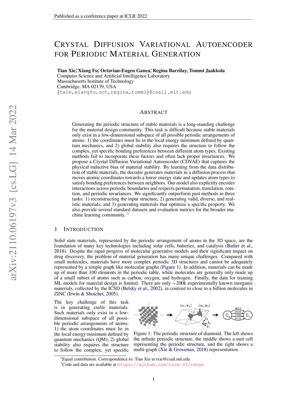 Generating the periodic structure of stable materials is a long-standing challenge for the material design community. This task is difficult because stable materials only exist in a low-dimensional subspace of all possible periodic arrangements of atoms: 1) the coordinates must lie in the local energy minimum defined by quantum mechanics, and 2) global stability also requires the structure to follow the complex, yet specific bonding preferences between different atom types. Existing methods fail to incorporate these factors and often lack proper invariances. We propose a Crystal Diffusion Variational Autoencoder (CDVAE) that captures the physical inductive bias of material stability. By learning from the data distribution of stable materials, the decoder generates materials in a diffusion process that moves atomic coordinates towards a lower energy state and updates atom types to satisfy bonding preferences between neighbors. Our model also explicitly encodes interactions across periodic boundaries and respects permutation, translation, rotation, and periodic invariances. We significantly outperform past methods in three tasks: 1) reconstructing the input structure, 2) generating valid, diverse, and realistic materials, and 3) generating materials that optimize a specific property. We also provide several standard datasets and evaluation metrics for the broader machine learning community.