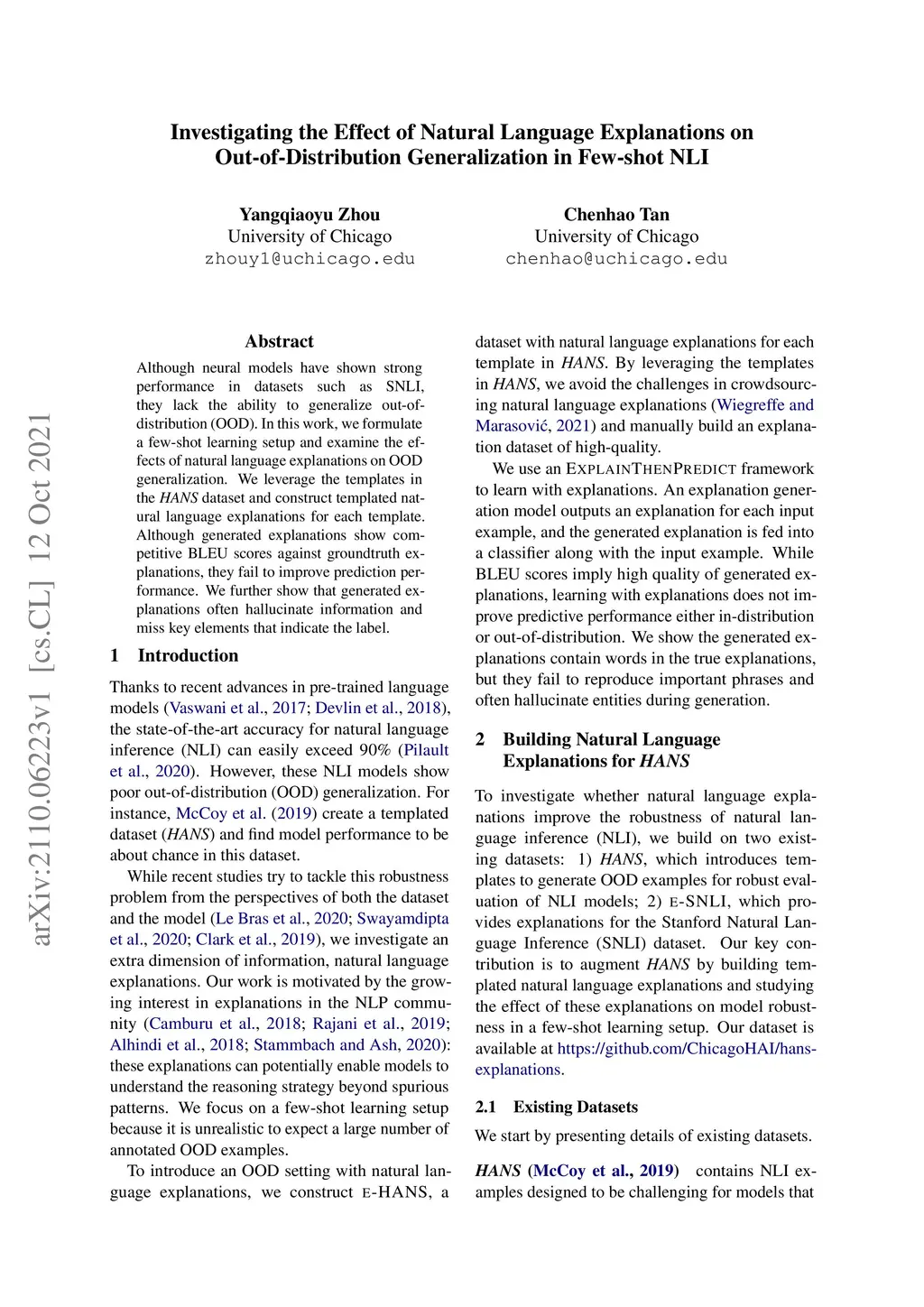 Although neural models have shown strong performance in datasets such as SNLI, they lack the ability to generalize out-of-distribution (OOD). In this work, we formulate a few-shot learning setup and examine the effects of natural language explanations on OOD generalization. We leverage the templates in the HANS dataset and construct templated natural language explanations for each template. Although generated explanations show competitive BLEU scores against groundtruth explanations, they fail to improve prediction performance. We further show that generated explanations often hallucinate information and miss key elements that indicate the label.