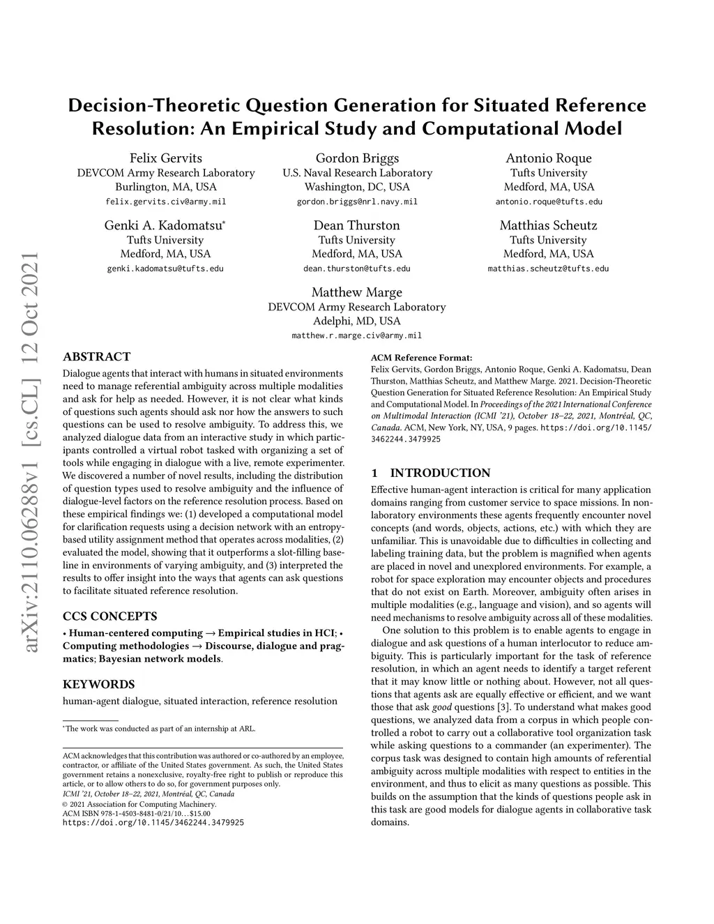 Dialogue agents that interact with humans in situated environments need to manage referential ambiguity across multiple modalities and ask for help as needed. However, it is not clear what kinds of questions such agents should ask nor how the answers to such questions can be used to resolve ambiguity. To address this, we analyzed dialogue data from an interactive study in which participants controlled a virtual robot tasked with organizing a set of tools while engaging in dialogue with a live, remote experimenter. We discovered a number of novel results, including the distribution of question types used to resolve ambiguity and the influence of dialogue-level factors on the reference resolution process. Based on these empirical findings we: (1) developed a computational model for clarification requests using a decision network with an entropy-based utility assignment method that operates across modalities, (2) evaluated the model, showing that it outperforms a slot-filling baseline in environments of varying ambiguity, and (3) interpreted the results to offer insight into the ways that agents can ask questions to facilitate situated reference resolution.