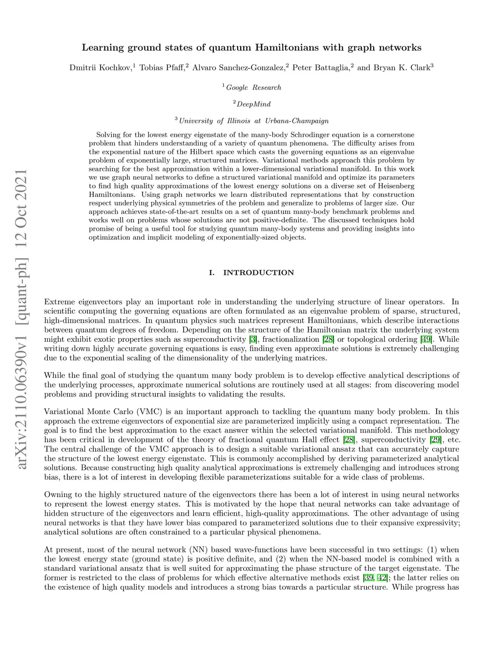 Solving for the lowest energy eigenstate of the many-body Schrodinger equation is a cornerstone problem that hinders understanding of a variety of quantum phenomena. The difficulty arises from the exponential nature of the Hilbert space which casts the governing equations as an eigenvalue problem of exponentially large, structured matrices. Variational methods approach this problem by searching for the best approximation within a lower-dimensional variational manifold. In this work we use graph neural networks to define a structured variational manifold and optimize its parameters to find high quality approximations of the lowest energy solutions on a diverse set of Heisenberg Hamiltonians. Using graph networks we learn distributed representations that by construction respect underlying physical symmetries of the problem and generalize to problems of larger size. Our approach achieves state-of-the-art results on a set of quantum many-body benchmark problems and works well on problems whose solutions are not positive-definite. The discussed techniques hold promise of being a useful tool for studying quantum many-body systems and providing insights into optimization and implicit modeling of exponentially-sized objects.