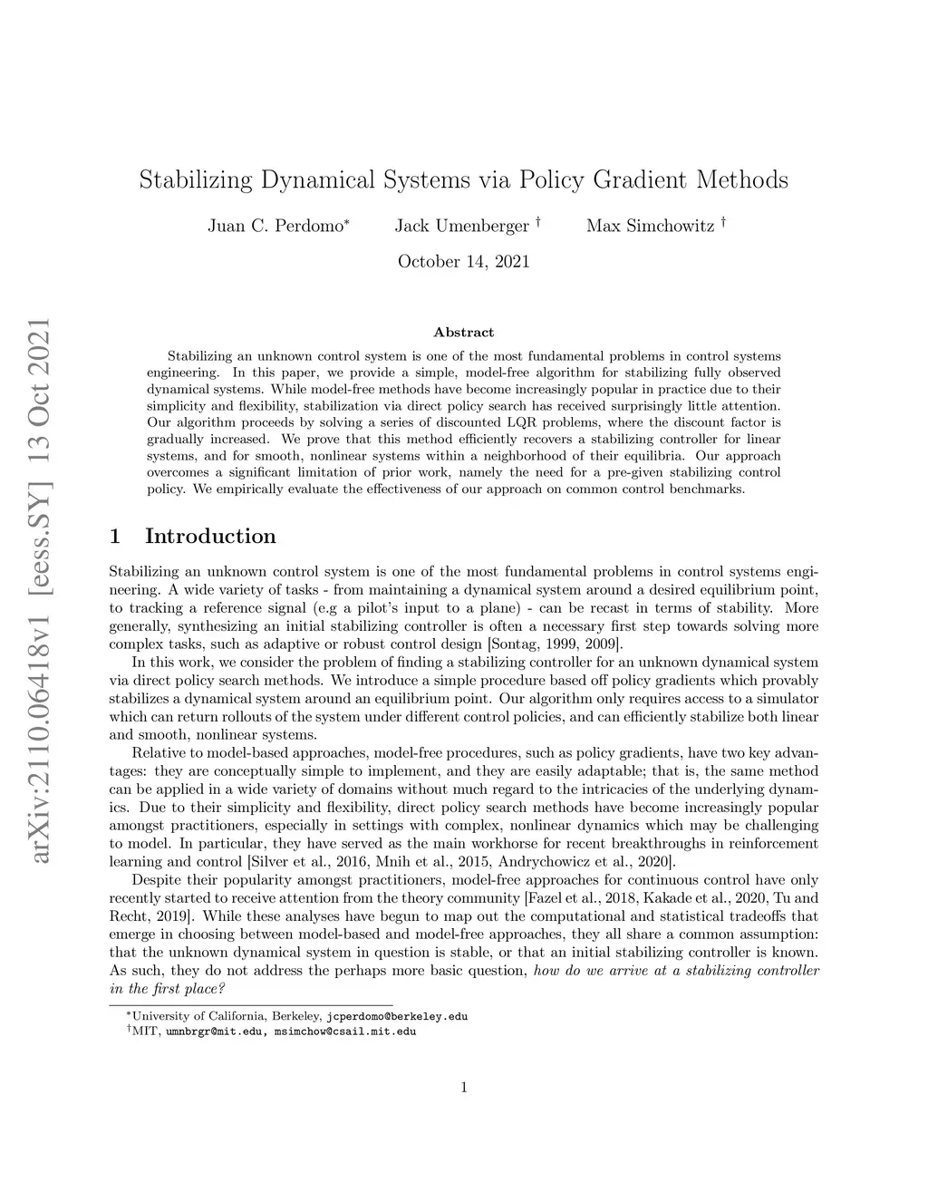 Stabilizing an unknown control system is one of the most fundamental problems in control systems engineering. In this paper, we provide a simple, model-free algorithm for stabilizing fully observed dynamical systems. While model-free methods have become increasingly popular in practice due to their simplicity and flexibility, stabilization via direct policy search has received surprisingly little attention. Our algorithm proceeds by solving a series of discounted LQR problems, where the discount factor is gradually increased. We prove that this method efficiently recovers a stabilizing controller for linear systems, and for smooth, nonlinear systems within a neighborhood of their equilibria. Our approach overcomes a significant limitation of prior work, namely the need for a pre-given stabilizing control policy. We empirically evaluate the effectiveness of our approach on common control benchmarks.